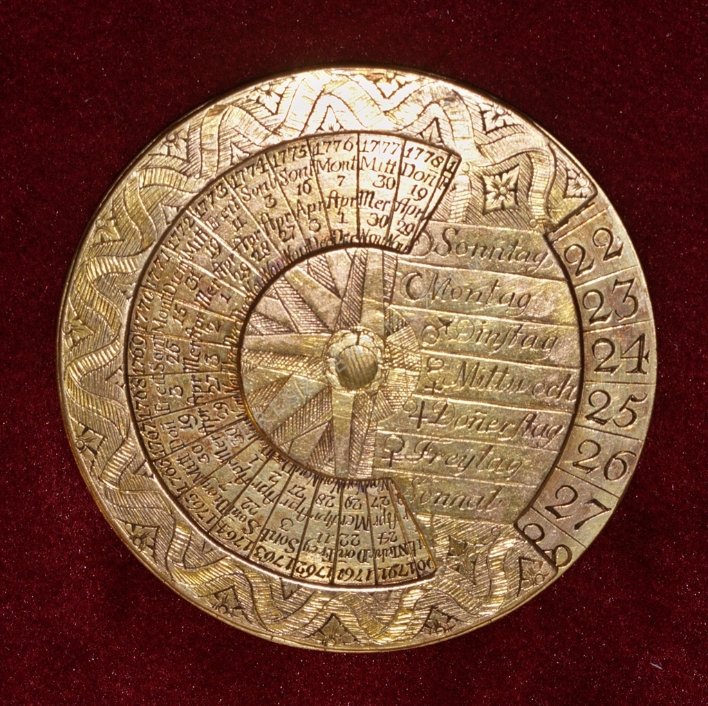 » Perpetual Calendar Origin date18th century Origin placeGermany Materialcopper Technique, engraved Sizesátmérő: 6,7 cm Inventory No.55.76.1 Download PDF Description and further information Német nyelvű, három, egymáshoz képest elforgatható korong. ProvenanceSan Marco gyűjtemény More ⮜ PreviousNext ⮞