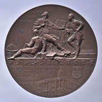 alatta az Egyetemi Könyvtár épülete, jobbra címer: könyvet tartó kéz felett hármas halmon kereszt.