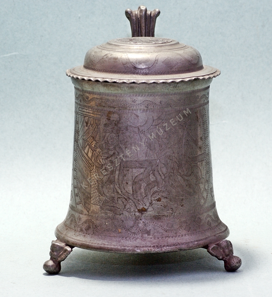 Hengeres, lefelé szélesedő testű, edény, három, angyalfejes lábon áll. Oldalán "Angyali üdvözlet" vésett jelenete.