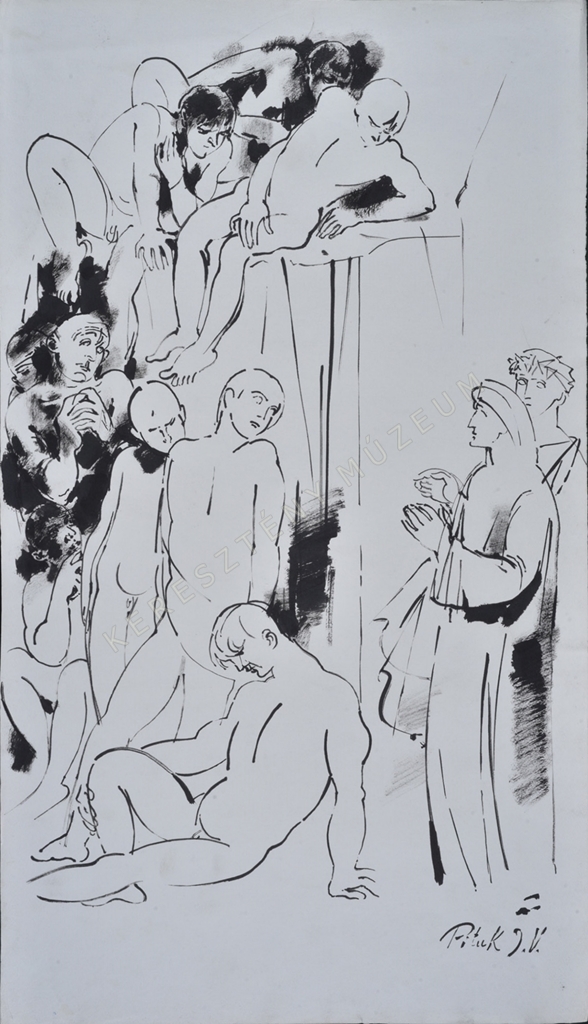 Álló kompozíció: Vergilius és Dante jobbról, a szikla tövében üldögélő-támaszkodó csoporthoz fordul.