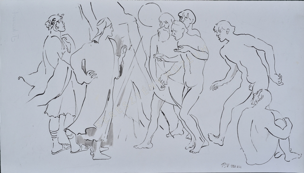 Jobbról érkező "árnyak" csoportja Dante árnyékát csodálja.