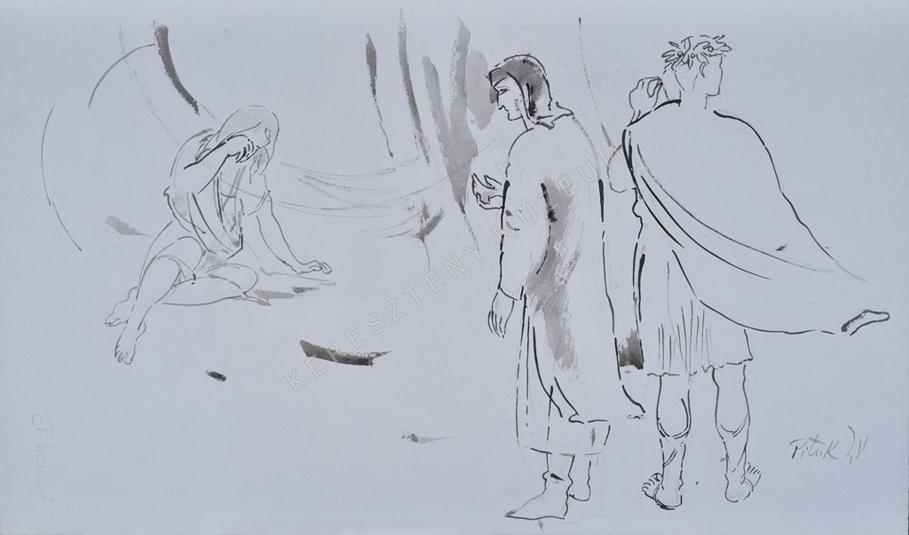 Baloldalt síró, szemét dörgölő lány ül, jobbról Dante és Vergilius közeledik.