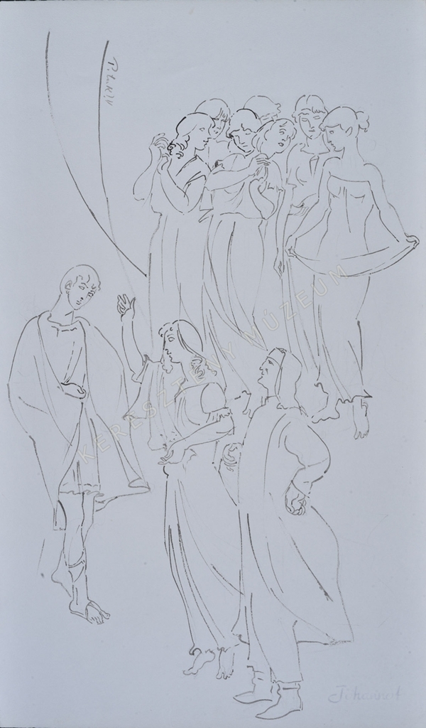 Álló kompozíció: lent Beatrice Vergiliusszal és Statiusszal; hátrább lányok kórusa.