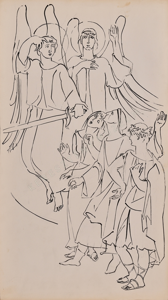 Két angyal, egyikük karddal, másikuk felemelt bal kézzel, száll Beatrice, Dante és Vergilius mellett.