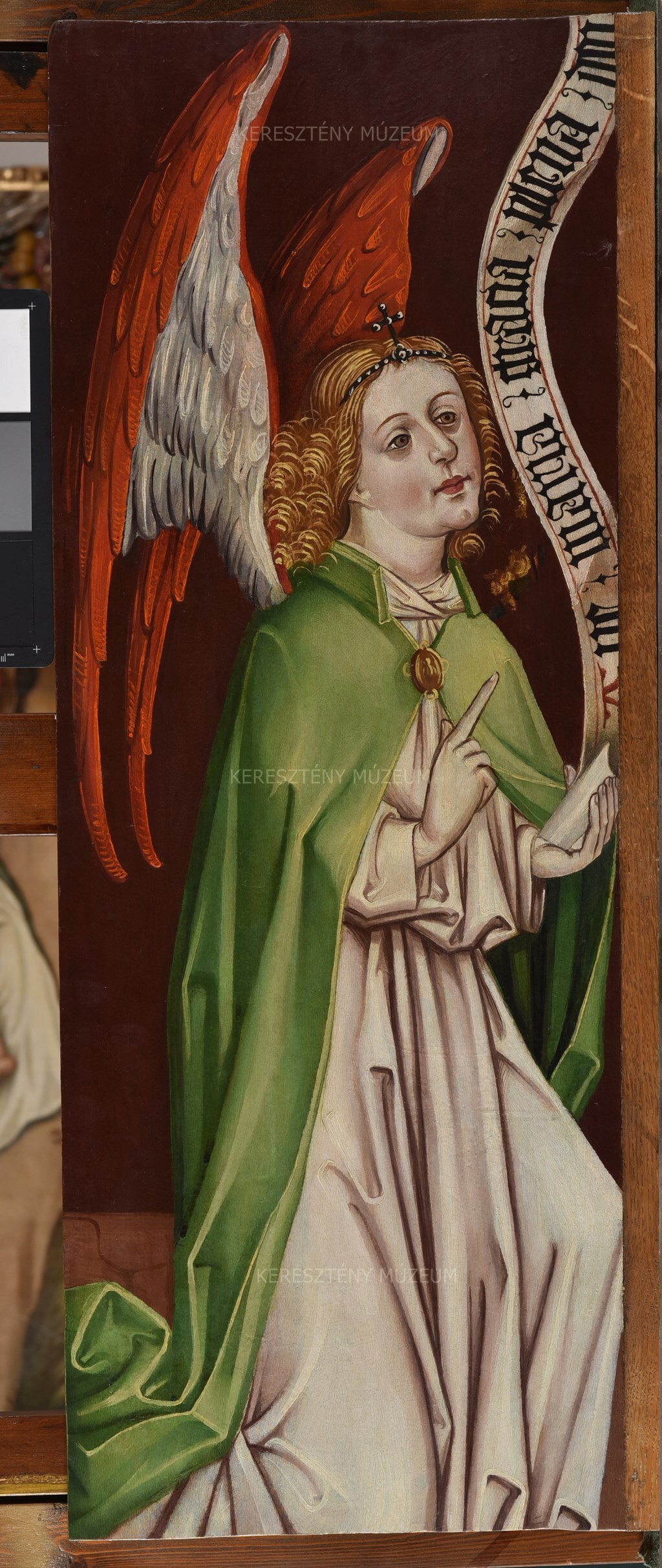 The panel painted on both sides originally belonged to the movable wing of a winged altarpiece, along with its companion panel (55.44 [45]). The depictions of St. Catherine and St. Barbara occupied the feast-day side of the wing, while Gabriel and the scene showing Mary receiving the Lord’s message adorned the workday side. The two panels had been framed together with the panel catalogued number 54.2 in the Christian Museum to form an antependium at the time they were discovered by Kornél Divald in the parish church of Bát. Because of their new role as part of the antependium, the panels had been trimmed so their height matched that of the altar stone. The master responsible for the work may have been a member of the workshop named for the St. Nicholas Altar in Jánosrét.