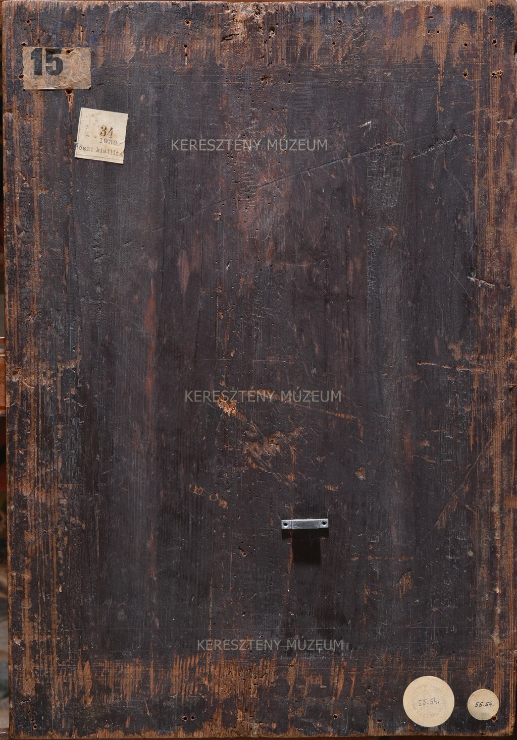Of the series, nos. 55.52 and 55.53 belonged to the Zichy collection and were acquired by the Municipal Gallery, later by the Museum of Fine Arts, and in 1937, as part of an exchange, by the Christian Museum. (The panels were received in exchange for two fragments depicting Mary of Sorrows and St. John the Evangelist from the predella of the Okolicsnó main altar). The other panels are from the collection of Arnold Ipolyi, who purchased them, according to Vilmos Fraknói, in the area of Kassa. 55.51: ‘77. Altarpiece wing images on wood: three holy pilgrims. Late 15th c.’ (Lakatos-Balla 290)