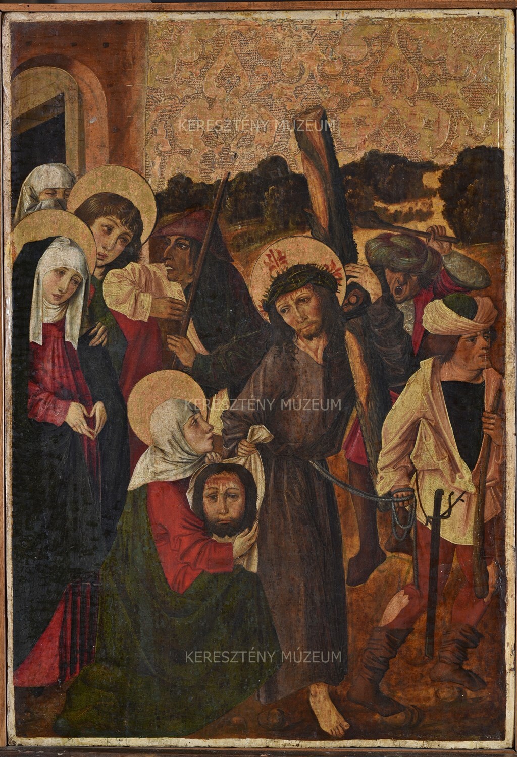 An outer image on one of the movable wings of the Calvary altarpiece of Garamszentbenedek. The altarpiece was part of the Late Gothic furnishings of the Benedictine abbey church of Garamszentbenedek. In 1905, its shrine was burned during the fire in the Primate’s Palace in Esztergom, with only the upper and two side slats surviving in a charred state. The shrine statues were also seriously damaged. Thanks to an archival photograph published in 1886 in Simor’s commemorative album, we are well acquainted with the altarpiece in its intact condition. The backboard of the shrine was originally adorned with gold stars (certainly on a blue ground).