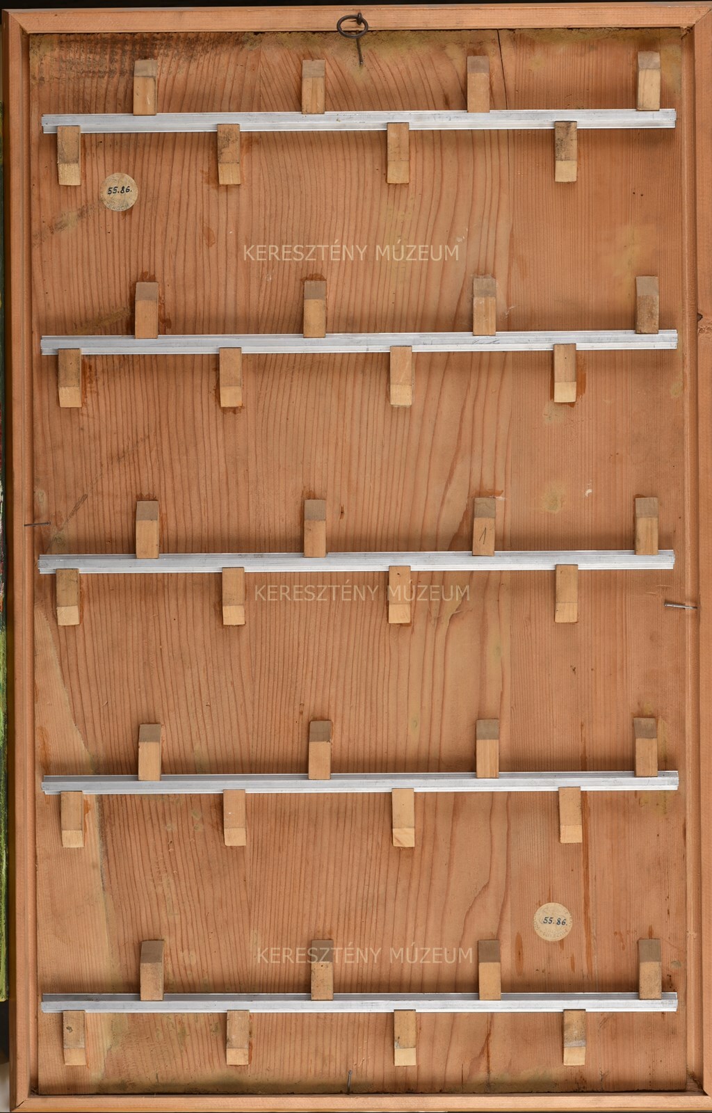 Dezső Varga, 1956: earlier overpainting was removed. Retouched areas using hatching (tratteggio) are visible on the panels, indicating an earlier restoration procedure.