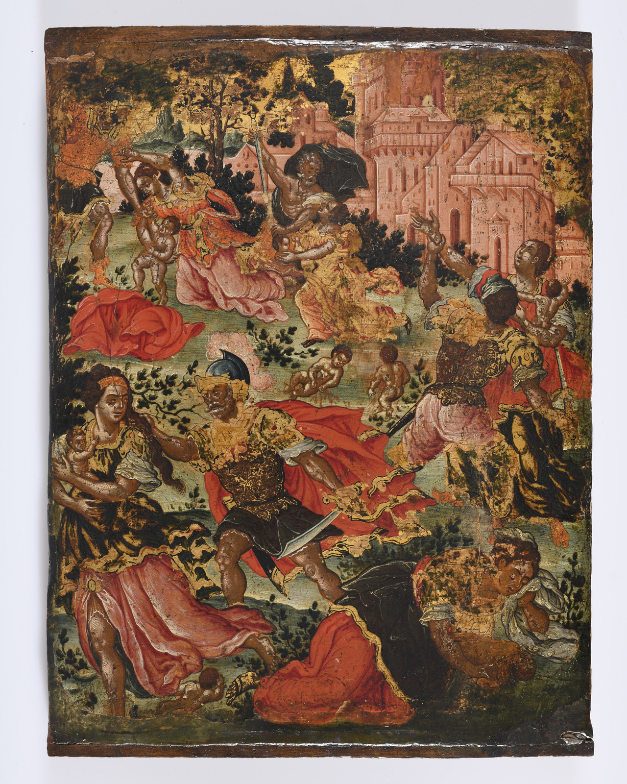 A történetet Máté evangélista írja le (Máté 2, 13-18). Heródes embereinek brutális tette a régi művészet gyakori témájává vált. A krétai festő képén a jelenet meredeken emelkedő sziklás tájban, épületek és arany háttér előtt játszódik. Az élénk színek és a mozgalmas kompozíció az irgalmat nem ismerő katonák és a menekülő vagy kétségbeesetten ellenszegülő anyák közötti küzdelmet hangsúlyozza. Az egymásnak feszülő alakok között a földet a lemészárolt csecsemők élettelen teste borítja, az előtérben fájdalomtól megtört anya siratja halott gyermekét.