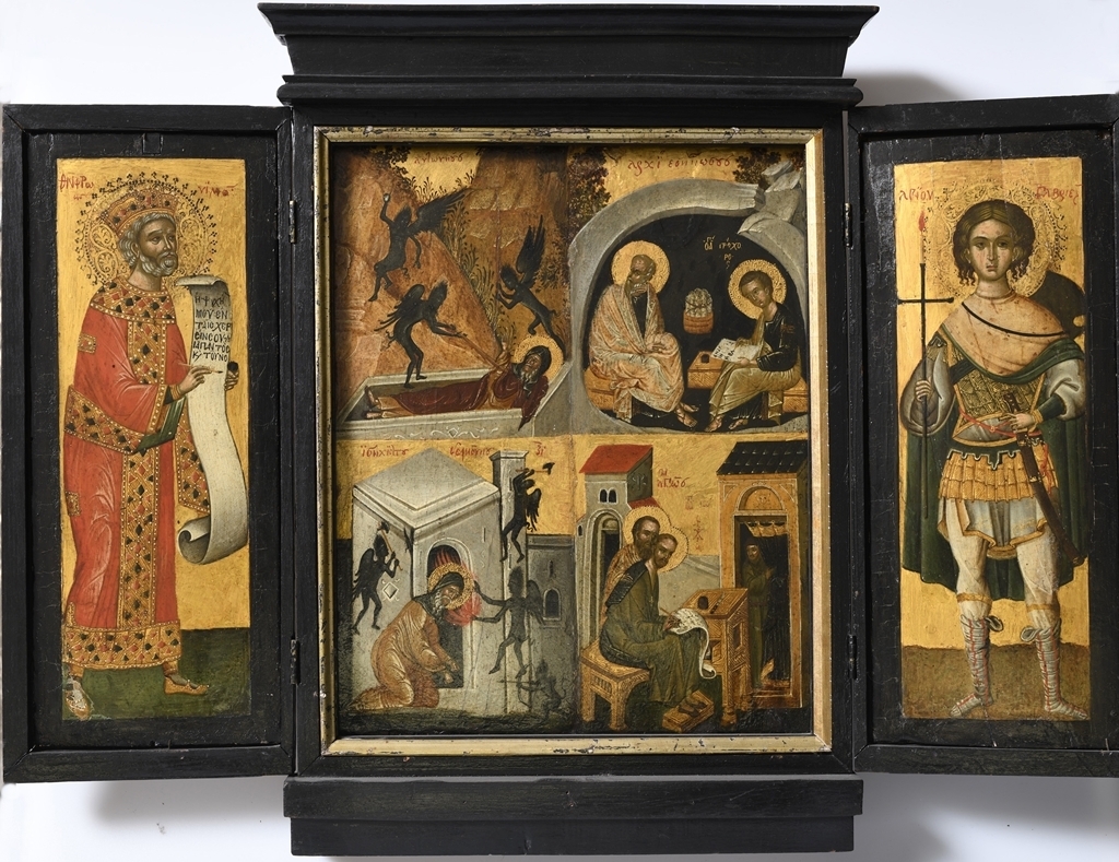 A behajtható szárnyú házioltár középső részén több jelenet látható: balra fönt és lent Remete Szent Antalt, a sivatagi atyát, a szerzetesség egyik alapítójaként tisztelt szentet látjuk, ahogy démonok kínozzák. Jobbra fönt Szent János evangélista diktálja a Jelenések Könyvét tanítványának, Prohorosznak, alul Szent Pál diktál Aranyszájú Szent Jánosnak. A bal szárnyon Dávid próféta, a jobbon Szent Fanuriosz álló alakja jelenik meg. Fanurioszhoz, a keleti egyházban tisztelt mártírszenthez elveszett dolgok megtalálásáért fohászkodtak a hívők.
