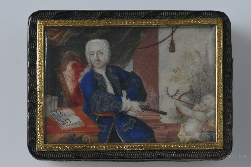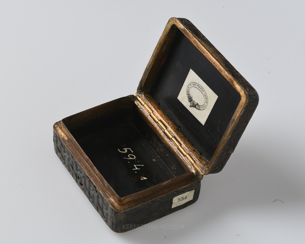 Téglatest alakú doboz, zsanéros fedéllel. Fedelén vörösréz keretben, elefántcsont lapocskára festett miniatűr.
