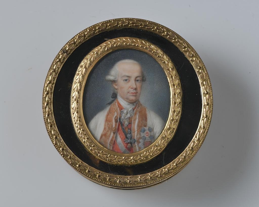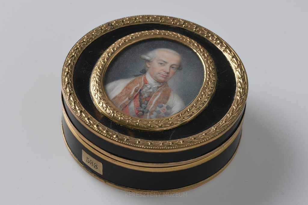 Kerek formájú, leemelhető fedellel. Elefántcsont lapra festett miniatűr: II. Lipót német császár, magyar és cseh király portréja