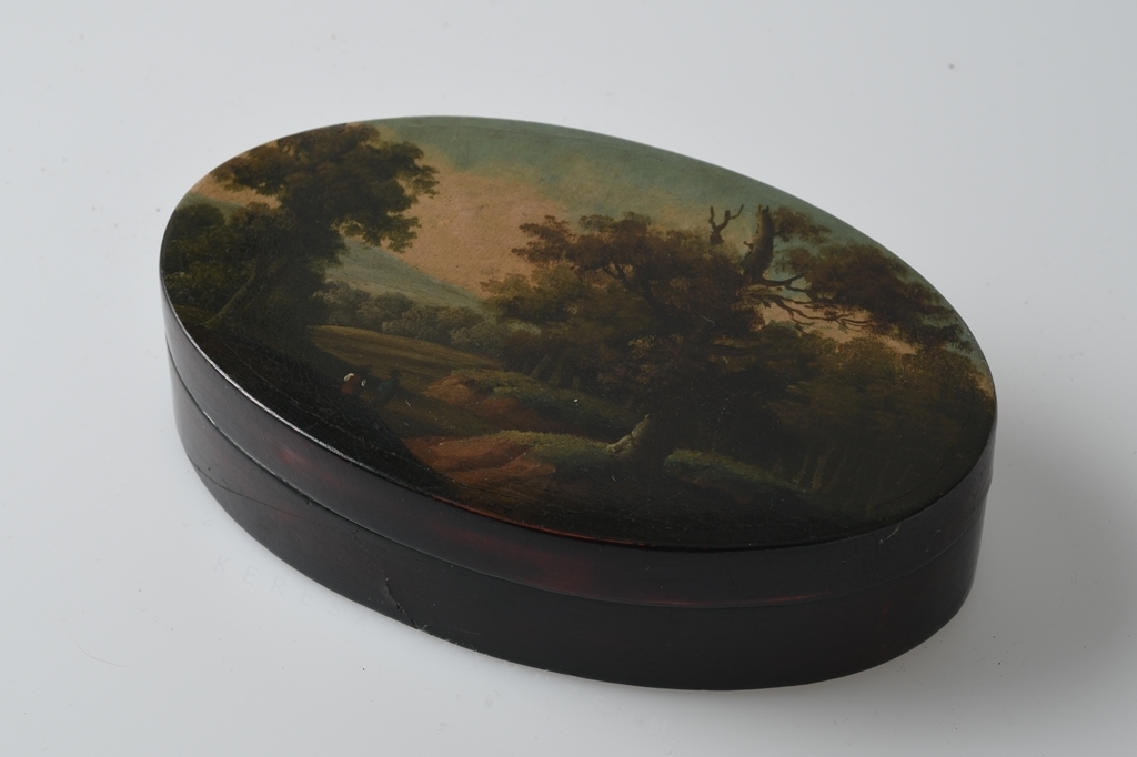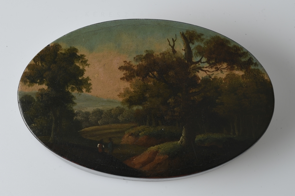 Ovális alakú,leemelhető fedéllel, oldalán, kívül fekete-vrös lakkfestés a Guárin-munkák stílusában. Fedelén tájkép Pascha Weitsch modorában.