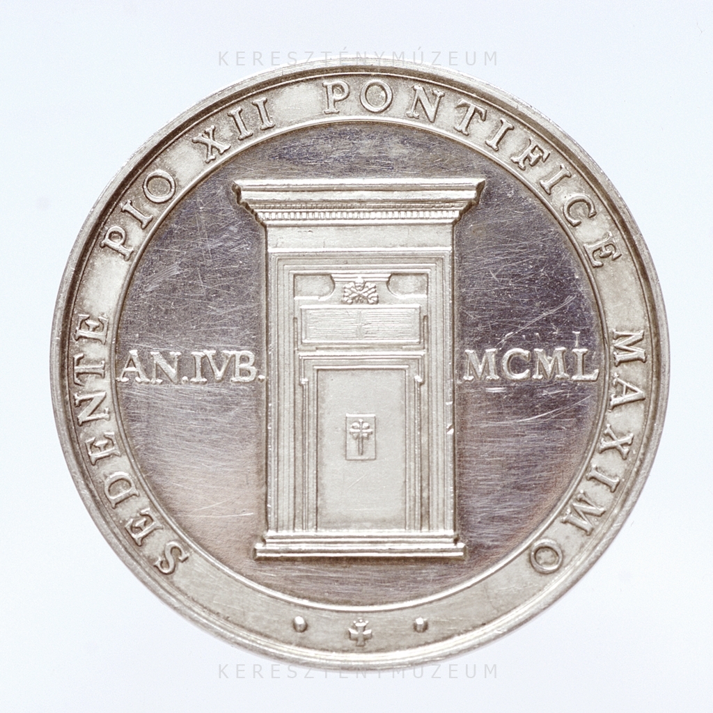 Az 1950-ben kibocsátott, alkalmi érem, amelyet az olasz pénzverde csiszolt háttérrel vert a Lateráni Keresztelő Szent János bazilika Szent Kapujának nyitásának és bezárásának emlékére. Előlap: kettős, sima gyűrűben a zárt Szent Kapu, középen latin kereszt. Az architrávon a pápai jelvények: kettős kulcs és a tiara. Körirata magyarul: XII. Piusz pápa uralkodása idején az 1950. jubileumi évben. Hátlap: sima, hármas gyűrűben barokkos pajzs, hat soros latin nyelvű szöveggel: A szentséges lateránitemplom a város és a világ összes templomának anyja és feje. Csúcsán a pápai jelvények, a kettős kulcs és a tiara. Körirat: Clemente Micara bíboros, veliteri püspök pápai követ megnyitotta és bezárta.