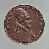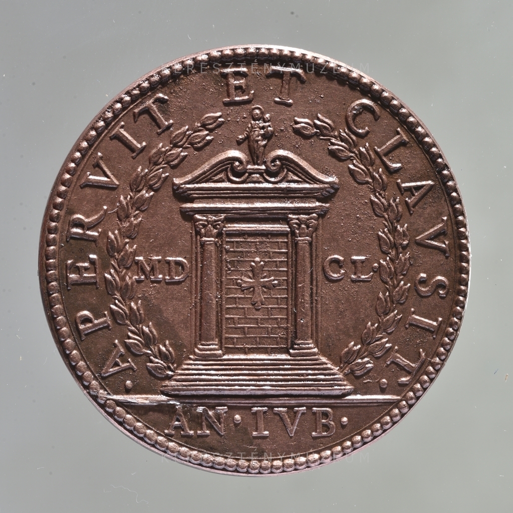 Újravert-riconii érem az 1650-es Szentév emlékére. Előlap: gyöngysoros keretben a pápa arcképe jobb profilból, vállán palást, fején tiara. Hátlap: gyöngysoros keretben a bezárult Szent Kapu, babérkoszorúban, közepén liliomos görög kereszt. A timpanon csúcsán Mária, a gyermek Jézussal.