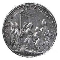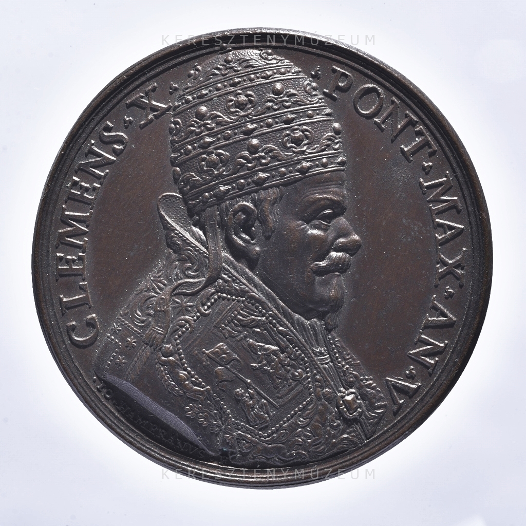 Hibrid, újravert-riconii érem, a Szent Kapu megnyitásáról. 1674. május 3-án hirdette ki a pápa az Ad Apostolicae vocis oraculum bullával a következő Szentévet. Előlap: gyöngysoros keretben a pápa arcképe jobb profilból. Vállán palást, fején tiara. Hátlap: egyszerűsített ábrázolása a Szent Kapu nyitásának gyöngysoros keretben. A pápa három püspök és egy diakónus kíséretében, csákánnyal áll a kapu előtt.