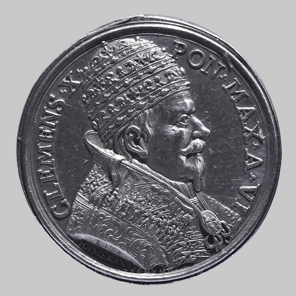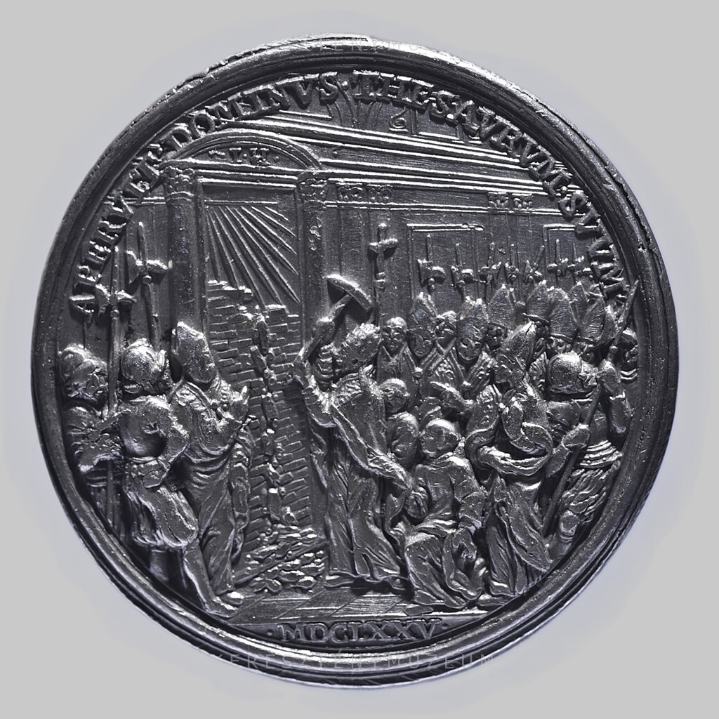A Szent Kapu megnyitásának emlékére kiadott érem. 1674. május 3-án hirdette ki a pápa az Ad Apostolicae vocis oraculum kezdetű bullával a 15. szentévet. Elrendelte, hogy jubileumi szentév megnyitásának örömére, karácsony estéjét megelőző három napon, néhány óráig szóljon Róma minden harangja. Előlap: a pápa arcképe jobb profilból. Vállán palást, fején tiara. Palástja vállhímzésén a Szent Kapuhoz vonuló zarándokok végtelen sokasága között ő maga, a pápai hordszéken. A palást mellcsatján Szűz Mária alakja, a gyermek Jézussal. Hátlap: a pápa csákánnyal bontja a kapu záró falazatát, a téglák lába elé hullanak. A nyíláson fénysugarak törnek elő. Mögötte két térdelő diakónus és a püspöki asszisztencia. Balról a pápai testőrség, a svájci gárda alabárdos katonái.