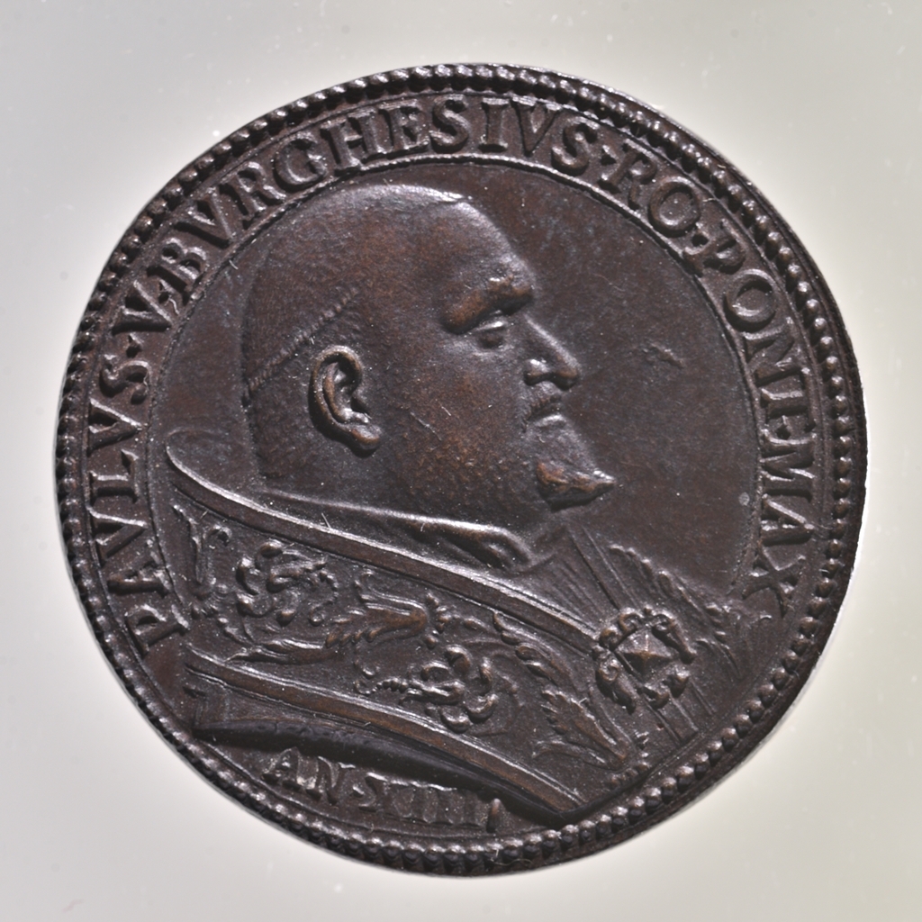 Előlap: PAVLVS•V•BVRGHESIVS•RO•PONT•MAX_AN•XIII | Hátlap: PRO•TVI• NOM_INIS•GLORIA | a szobor talapzatán: PA|VL|VS|V •