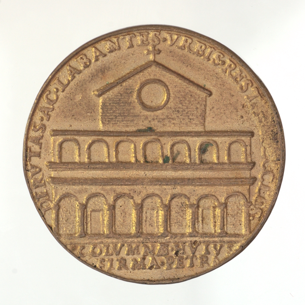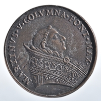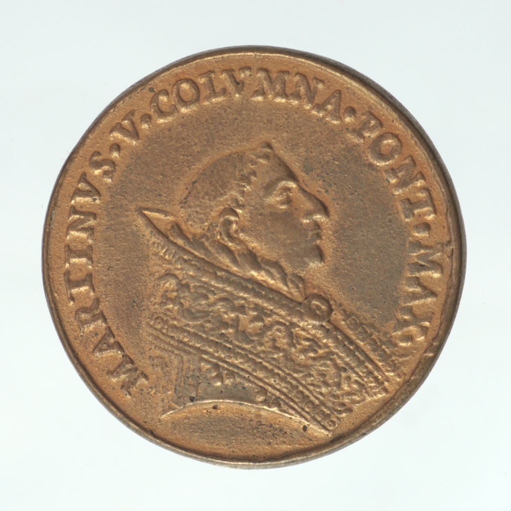 Előlap: MARTINVS•V•COLVMNA•PONT•MAX•|Hátlap: DIRVTA•AC•LABANTES•VRBIS•RESTAVR•ECCLES•|szelvényben: COLVMNAE•HVIV•|FIRMA•PETR•