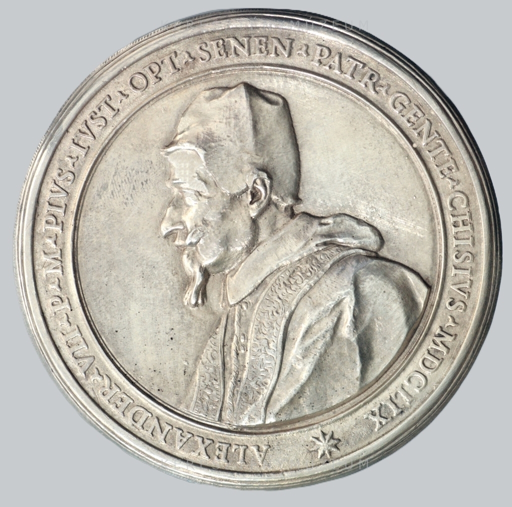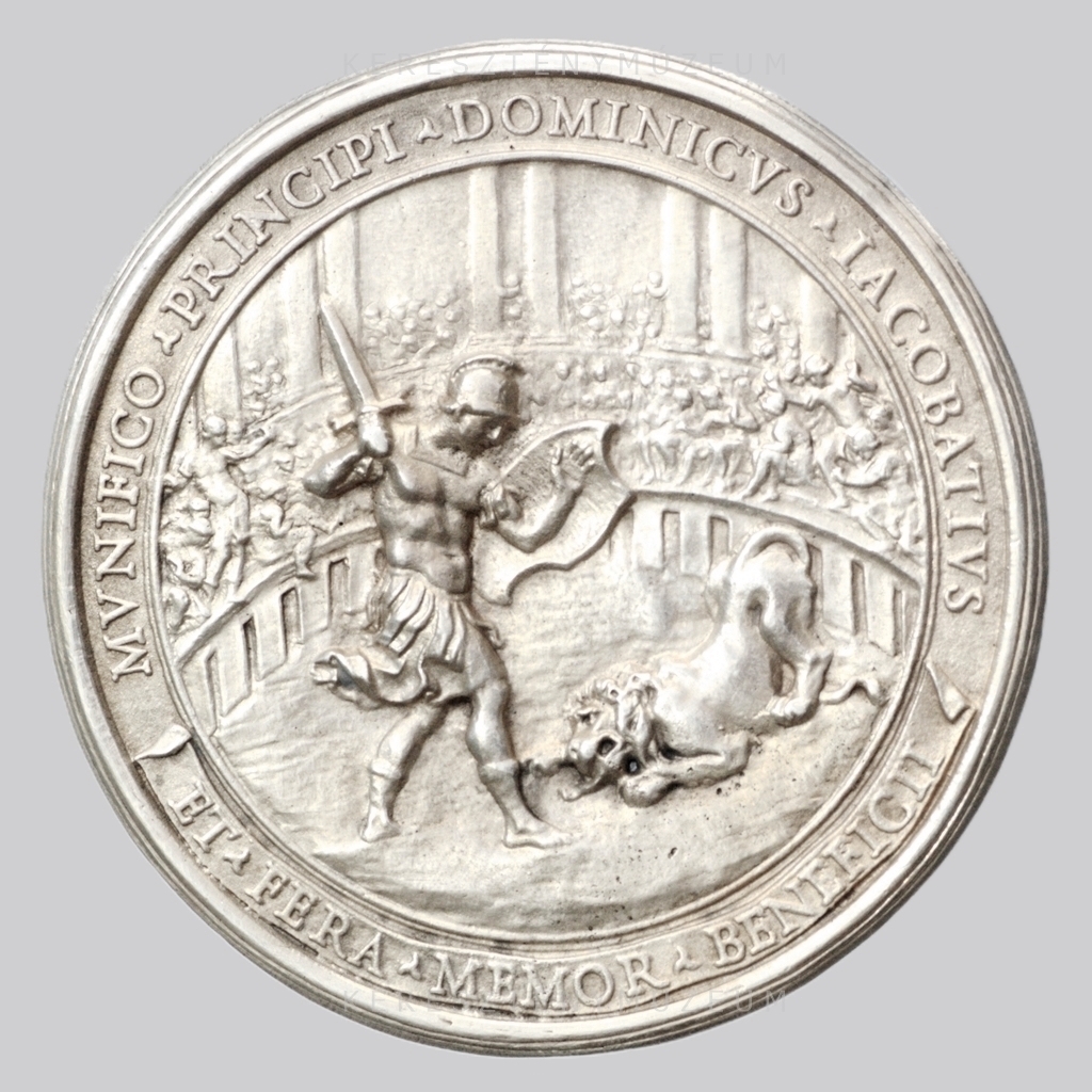 Előlap: * ALEXANDER•VII•P•M•PIVS•IVST•OPT•SENEN•PATR•GENTE•CHISIVS•MDCLIX |Hátlap: MVNIFICO•PRINCIPI•DOMINICVS•IACOBATIVS mondatszalagon: ET•FERA•MEMOR•BENEFICII