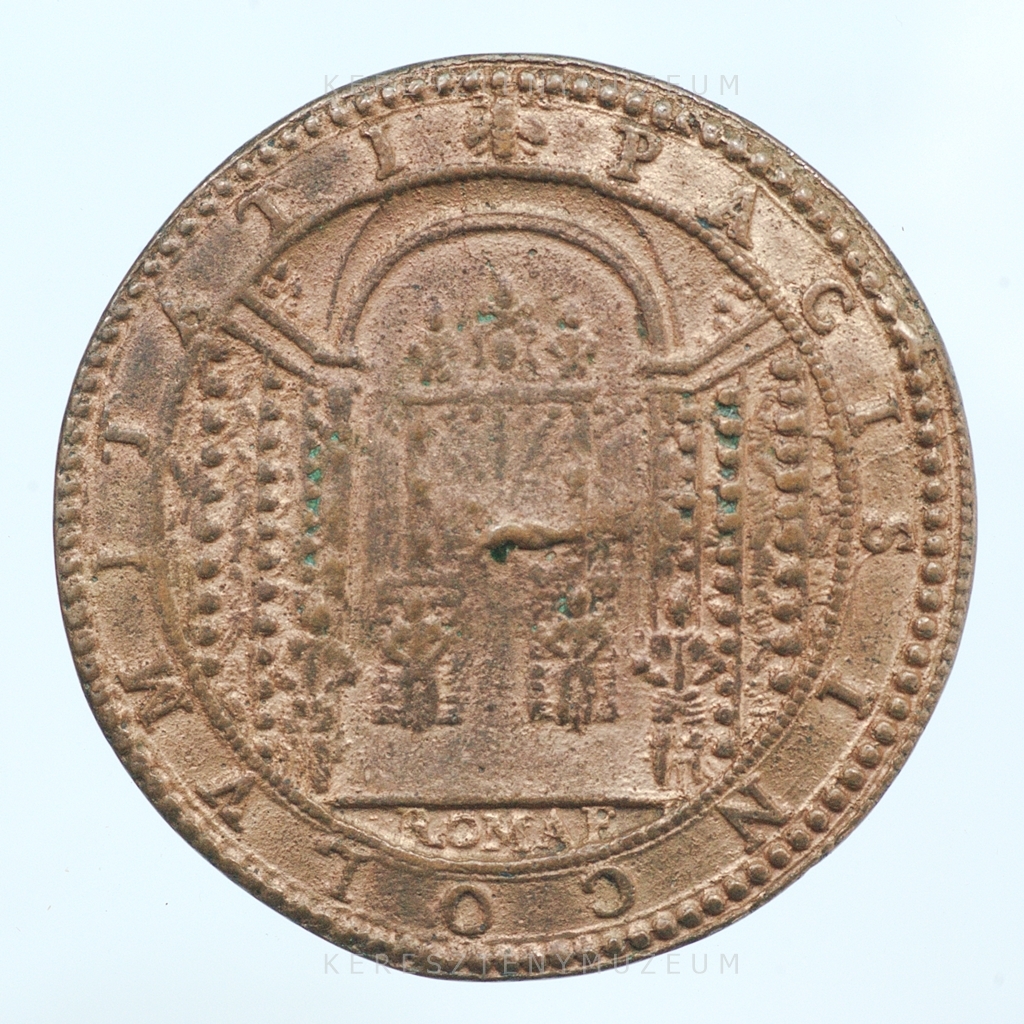 előlapon. Előlap: gyöngysoros keretben a pápa mellképe jobb nézetből. Vállán palást, feje fedetlen. Hátlap: kettős