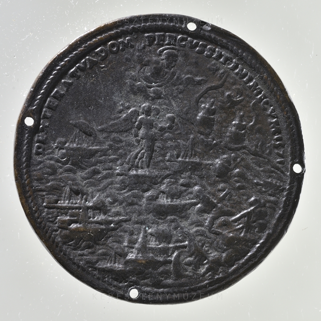 1571-ben, a lepantói csata emlékére kiadott érem utánverete. Előlap: sodronydíszes keretben a pápa mellképe, bal profilból. Vállán mocétum, fején camauro. Hátlap: tengeri csatajelenet, bal oldalon a Szent Liga gályái, középen a Győzelem szárnyas, allegorikus alakja, kehellyel és körmeneti kereszttel. A felhők felett, Krisztus felemelt kezéből áradó sugárnyalábok süllyesztik el a török hajókat. Kopott, négy helyen átfúrva.