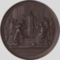 Az 1886. június 29-én kiadott évérem a Lateráni bazilika belő terében végzett bővítési és díszítési munkálatok emlékére. Előlap: peremes keretben a pápa mellképe bal profilból. Fején pileolus, vállán mocétum és stóla. A stóla hímzésén virág-ornamentika között Szent Péter alakja. Hátlap: A trón előtt álló pápa áldását fogadják, a bazilika helyreállításában résztvevő tervezők.