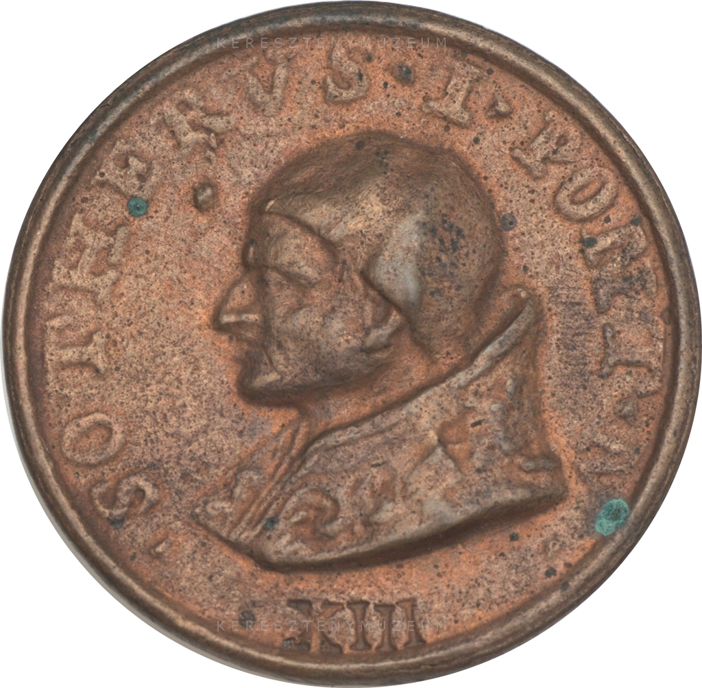 Előlap: a pápa bal profilú mellképe, vállán palást, fején camauro. Hátlap anepigrafikus - Krisztus arcképének lenyomata (Veronika kendője). Sima peremes keret, enyhén kopott, szulfátos kicsapódások