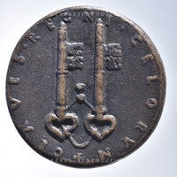 Előlap: a pápa mellképe jobb nézetből. Vállán palást, csattal, fején camauro. Hátlap: a pápai hatalmat jelképező, egymással összekötött, függőlegesen elhelyezett két kulcs. Perem nélkül, felületén természetes patina.