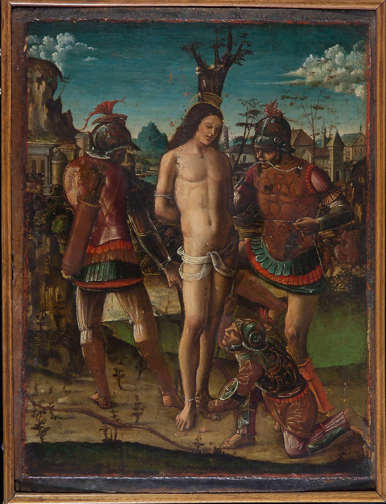 A 3. században élt római katonába, Sebestyénbe a Legenda Aurea elbeszélése szerint keresztény hite miatt addig lőttek nyilakat Diocletianus katonái, míg „olyan lett, mint egy sündisznó”. A halottnak hitt szentet magára hagyták, ő azonban csodálatos módon felépült sebeiből. A képen az a ritkán ábrázolt pillanat látható, amikor a nyilazás előtt a pribékek egy csonkolt fatörzshöz kötözik a szentet. Sebestyén nyugodt, szelíd arcát a festő szándékosan állította szembe a katonák brutális arckifejezésével. A kisméretű képet, melyet heterogén elemekből táplálkozó stílusa miatt nehéz megnyugtatóan meghatározni, Tátrai Vilmos feltételesen Riccardo Quartararónak attribuálta, a magángyűjteményben őrzött és Federico Zeri által Quartararónak tartott Szt. Mihály arkangyallal mutatott szoros stiláris hasonlóság alapján. Quartararo főként Szicíliában működött, élete során sokrétű, elsősorban ibériai-flamand és észak-itáliai (ferrarai, veronai, padovai) hatás érte. 1472-ben valószínűleg Valenciában járt, 1491-92-ben pedig Nápolyban teljesített számos megrendelést. A kép dél-itáliai származását valószínűsíti az a tény is, hogy egykor a nápolyi Capese Zurlo család tulajdonában volt, ahonnan San Marco gróf műgyűjteményén keresztül került a Keresztény Múzeumba. Sallay Dóra 2002 honlap