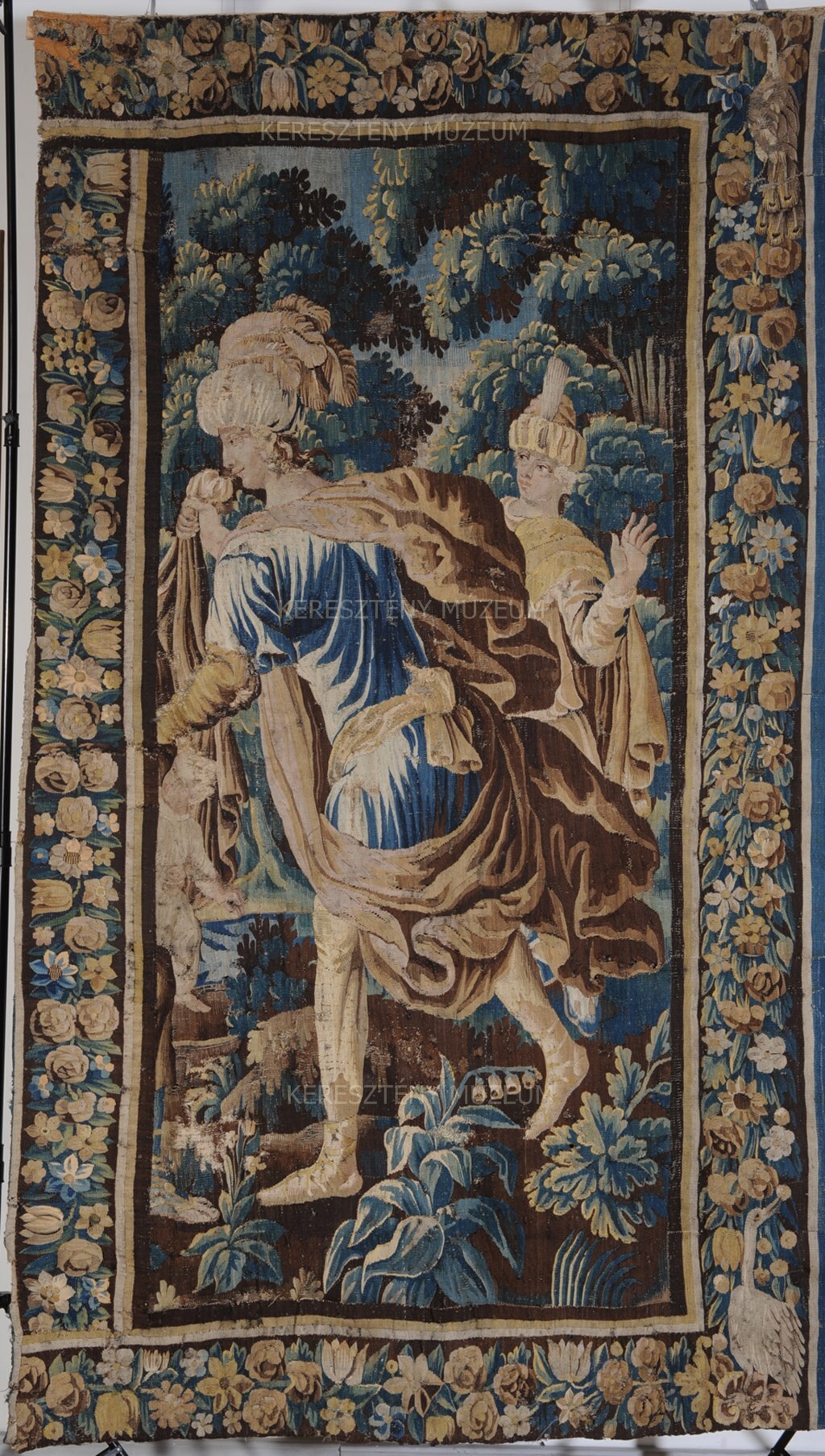 A bibliai jelenetet ábrázoló kárpit töredékes, csupán a történet mellékszereplőit látjuk, két férfit, akik a fáraó lányának kíséretéhez tartozhatnak. A gyermek Mózes a kép bal szélén látszik, alakja el van vágva. Alatta egy lábrészlet látszik. Mid a középképre. mind a virágfüzéres bordűrre korlátozott színskála (barnás és kékes tónusok) jellemző.