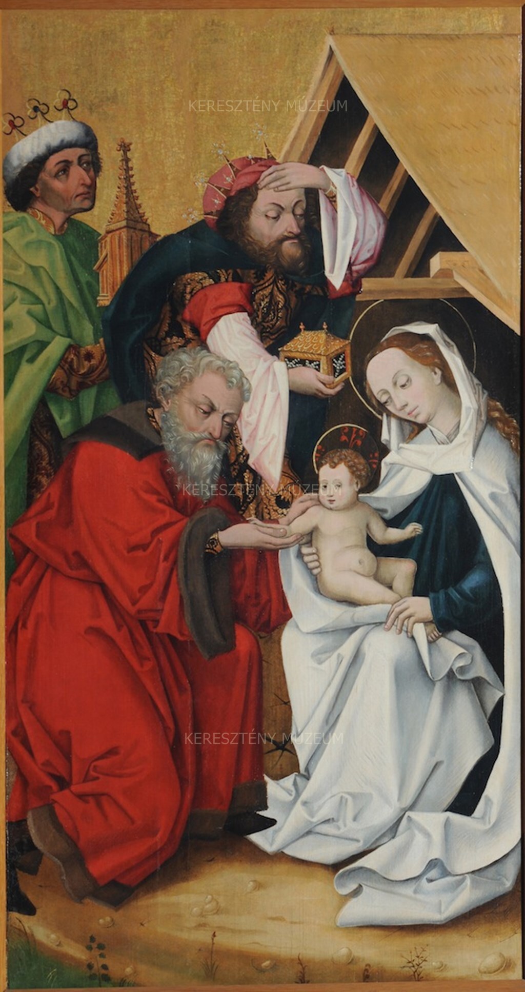 The composition, facial types, the movements of the figures, and the spatial relationships recall the painterly milieu of Hans Pleydenwurff. A close stylistic analogy to this picture is a work depicting the same theme in the Fränkische Galerie in Kronach (MA3419), which researchers have attributed to an assistant or family member of Pleydenwurff. Another analogous work is a painting of the Adoration of the Magi (Kremsmünster, Stiftsgalerie), dated to around 1460-70 by a painter referred to as the Master of Wartberg. The analogies demonstrate clearly the stylistic connections of these panels that arrived in Esztergom from Aranyosmarót: the influence of Pleydenwurff’ and his circle certainly reached the painter via Vienna.