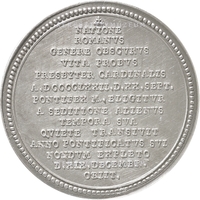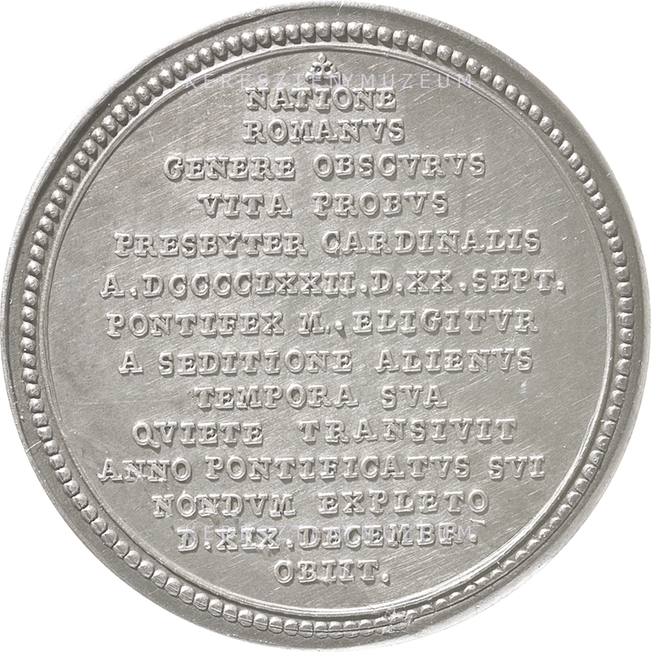 Előlap: DONVS • II • _ PONT • MAX • | Hátlap: NATIONE | ROMANVS | GENERE OBSCVRVS | VITA PROBVS | PRESBYTER CARDINALIS | A. DCCCCLXXII. D. XX. SEPT. | PONTIFEX M. ELIGITVR | A SEDITIONE ALIENVS | TEMPORA SVA | QVIETE TRANSIVIT | ANNO PONTIFICATVS SVI | NONDVM EXPLETO | D. XIX. DECEMBR. | OBIIT.