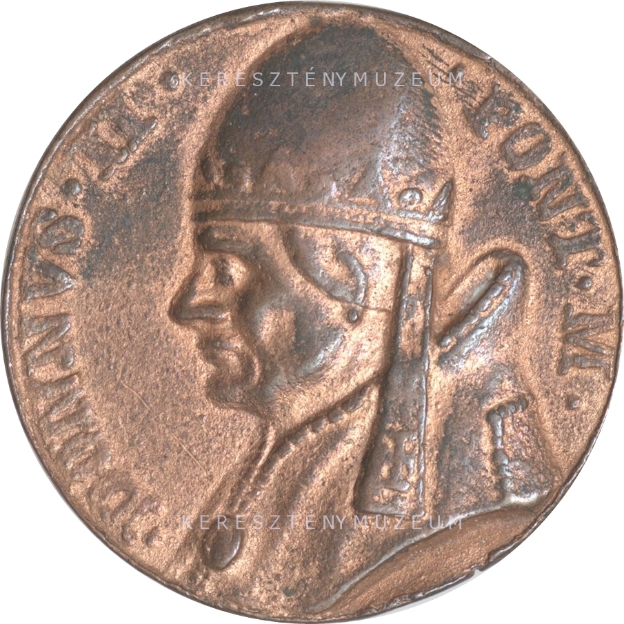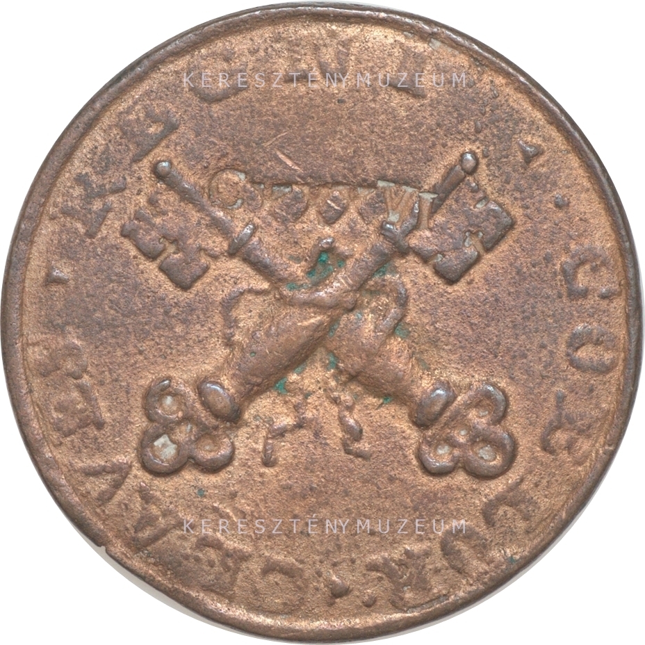 Enyhén kopott felület, sima perem. Előlap: balra tekintő mellkép, palástban, tiarával. Hátlap: a pápai hatalmat jelképező, egymással összekötött, és egymást átlósan keresztező két kulcs.