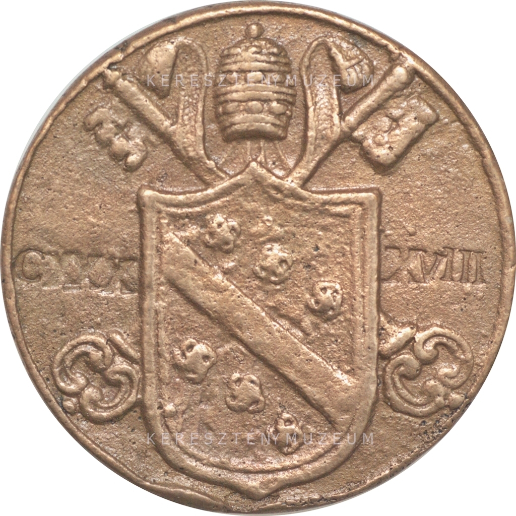 Sima perem. Előlap: a pápa mellképe bal nézetből. Vállán mocétum, fején camauro. Hátlap: aneprigrafikus - képzelt pápai címer, haránt pólyával vágott címerpajzs, a mezőkben 3-3 rozetta, a pápai hatalmat jelképező, keresztezett kulcsokra helyezve, tiarával koronázva.