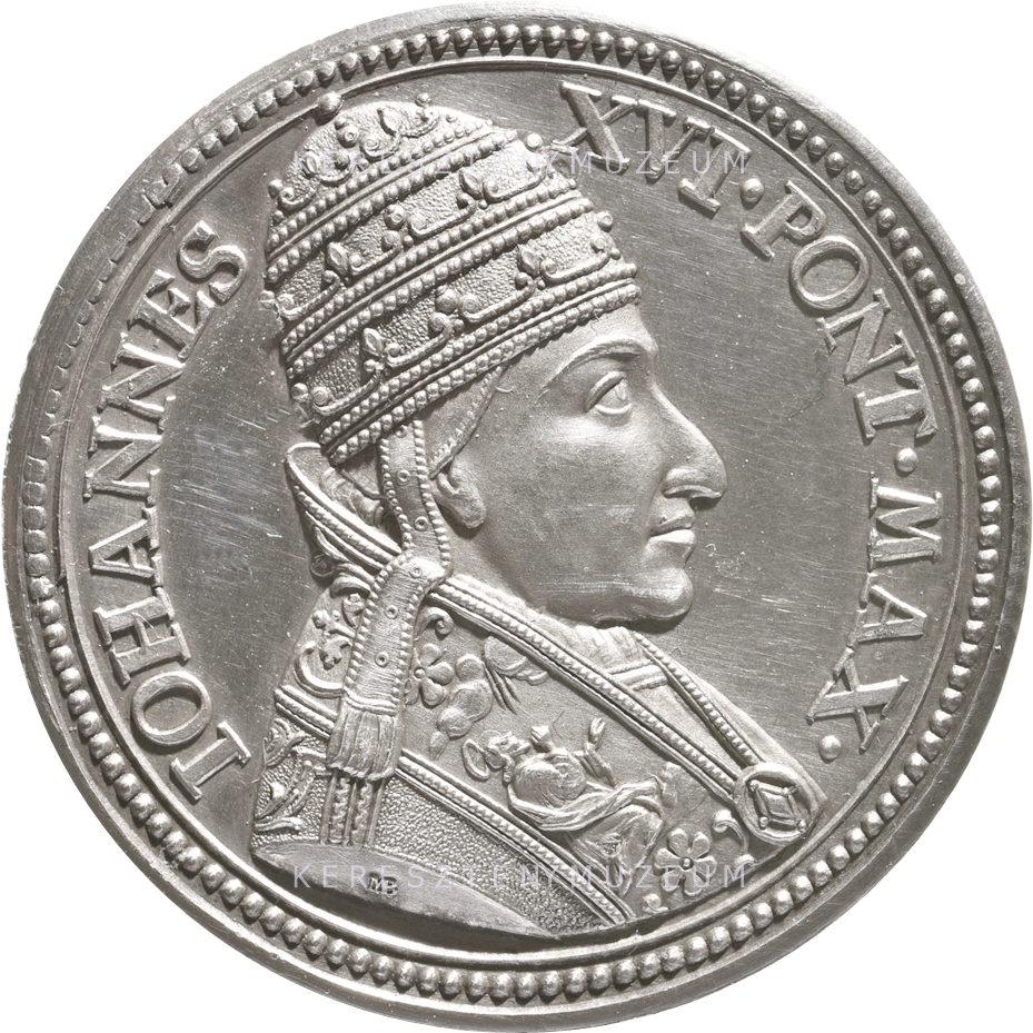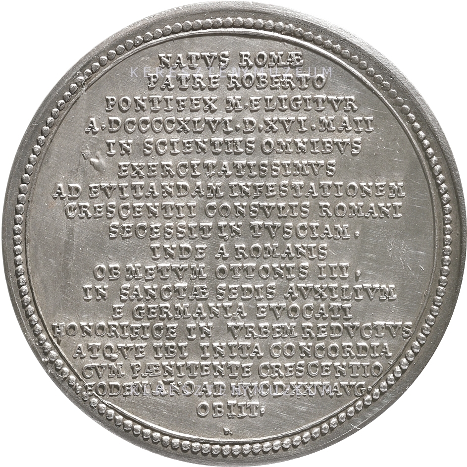 Előlap: IOHANNES _ XVI • PONT • MAX • |Hátlap: NATVS ROMAE PATRE ROBERTO PONTIFEX M. ELIGITVR A • DCCCXCVI. D. XVI. MAII IN SCIENTIIS OMNIBVS EXERCITATISSIMVS AD EVITANDAM INFESTATIONEM CRESCENTII CONSVLIS ROMANI SECCESIT IN TVSCIAM. INDE A ROMANIS OB METVM OTTONIS III. IN SANCTAE SEDIS AVXILIVM E GERMANIA EVOCATI HONORIFICE IN VRBEM REDVCTVS ATQVE IBI INITA CONCORDIA CVM PAENITENTE CRESCENTIO RODEMANO AD HVC D. XXV. AVG. OBIIT •