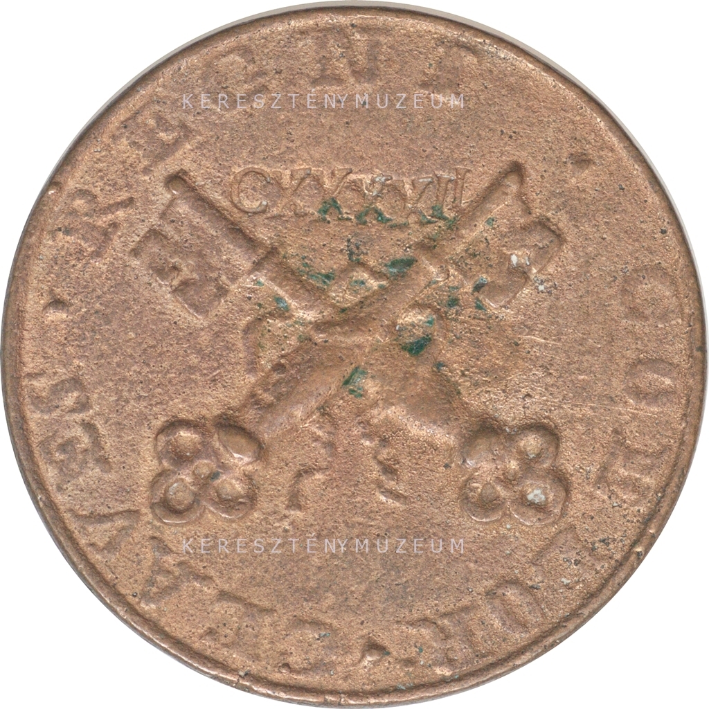 Restitúciós érem, sima perem, természetes patinával. Előlap: a pápa mellképe balról, vállán palást, fején tiara, egy koronagyűrűvel. Hátlap: a pápai hatalmat jelképező, egymással összekötött, és egymást átlósan keresztező két kulcs.