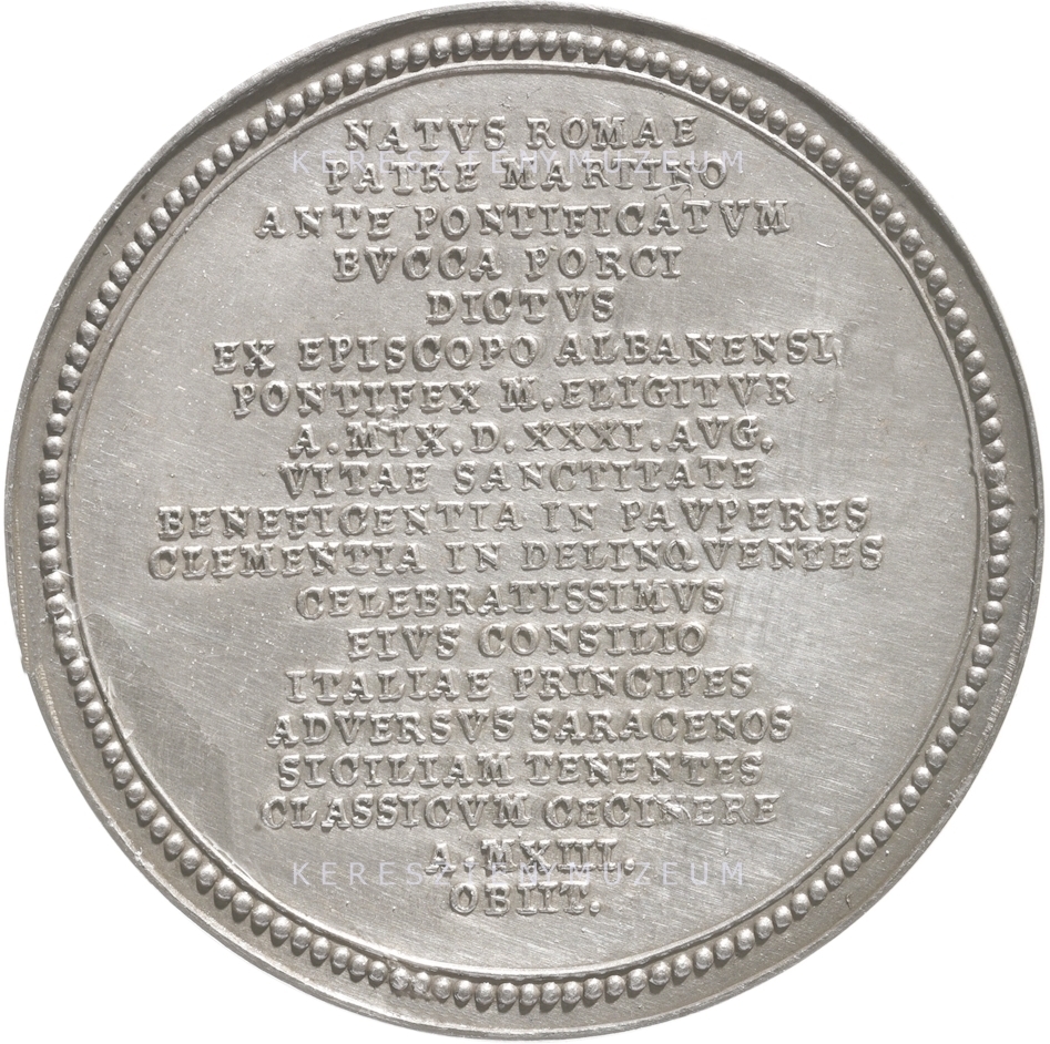 Előlap: SERGIVS • IV • PONT • MAX • |Hátlap: NATVS ROMAE PATRE MARTINO ANTE PONTIFICATVM BVCCA PORCI DICTVS EX EPISCOPO ALBANENSI PONTIFEX M. ELIGITVR A. MIX. D. XXXI. AVG. VITAE SANCTITATE BENEFICENTIA IN PAVPERES CLEMENTIA I N DELINQVENTES CELEBRATISSIMVS EIVS CONSILIO ITALIAE PRINIPES ADVERSVS SARACENOS SICILIAM TENENTES CLASSICVM CECINERE A. MXIII. OBIIT.