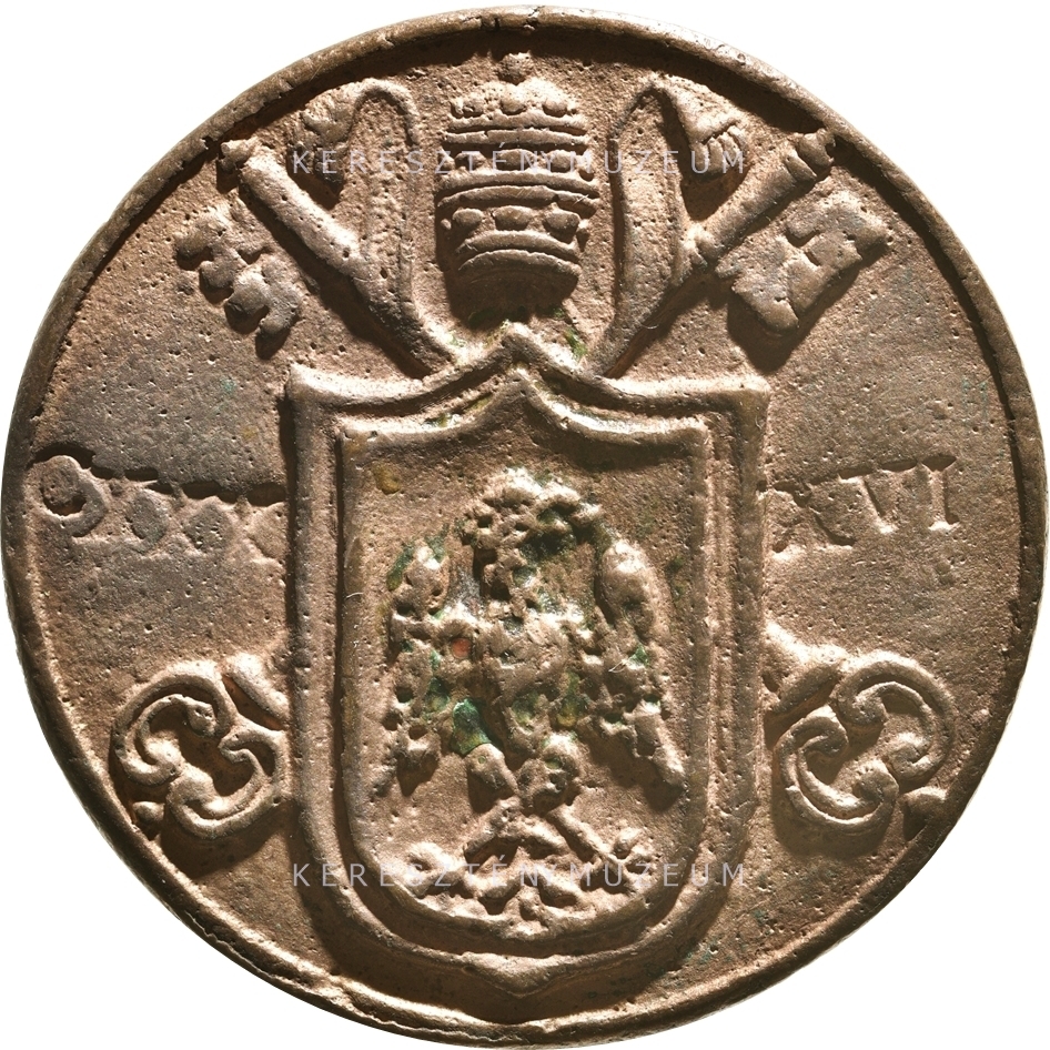 Restitúciós érem, sima perem, természetes patinázódás. Előlap: a pápa jobbra tekintő mellképe, vállán mocétum, és pallium, fején camauro. Hátlap: anepigrafikus - képzelt pápai címer, boglárpajzsban kitárt szárnyú, koronázott sas, a pápai hatalmat jelképező, keresztezett kulcsokra helyezve, tiarával koronázva.