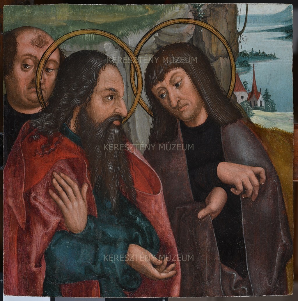 This small, trimmed and now square-shaped panel painting may have been a detail from a predella showing the Apostles’ Farewell. The male figure at the left edge, standing slightly to the back, conspicuously has no halo. Perhaps this explains why the earlier literature contained the completely unsubstantiated supposition that the donor was also included in the company of the apostles.