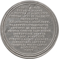 A 255 tételt tartalmazó restitúciós sorozathoz tartozó érem, amelyet Caspar G. Lauffer, a Nürnberger Münzstätte főgondnoka készíttetett 1700 és 1745 között. Sima perem, gyöngysoros gyűrűvel. Előlap: a pápa mellképe bal nézetből, vállán palást, feje fedetlen. Hátlap: rövid életrajz, 16 soros latin nyelvű szövegben, középre rendezve