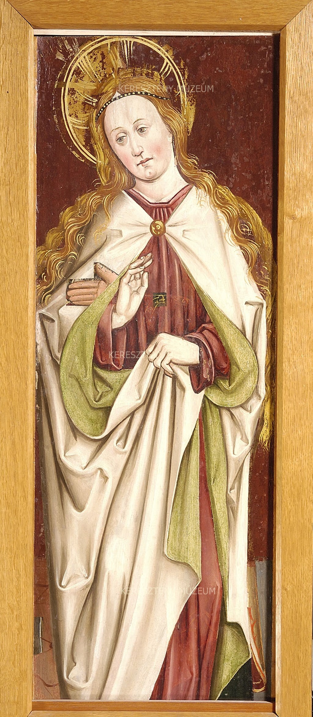 The panel painted on both sides originally belonged to the movable wing of a winged altarpiece, along with its companion panel (55.44 [45]). The depictions of St. Catherine and St. Barbara occupied the feast-day side of the wing, while Gabriel and the scene showing Mary receiving the Lord’s message adorned the workday side. The two panels had been framed together with the panel catalogued number 54.2 in the Christian Museum to form an antependium at the time they were discovered by Kornél Divald in the parish church of Bát. Because of their new role as part of the antependium, the panels had been trimmed so their height matched that of the altar stone. The master responsible for the work may have been a member of the workshop named for the St. Nicholas Altar in Jánosrét.