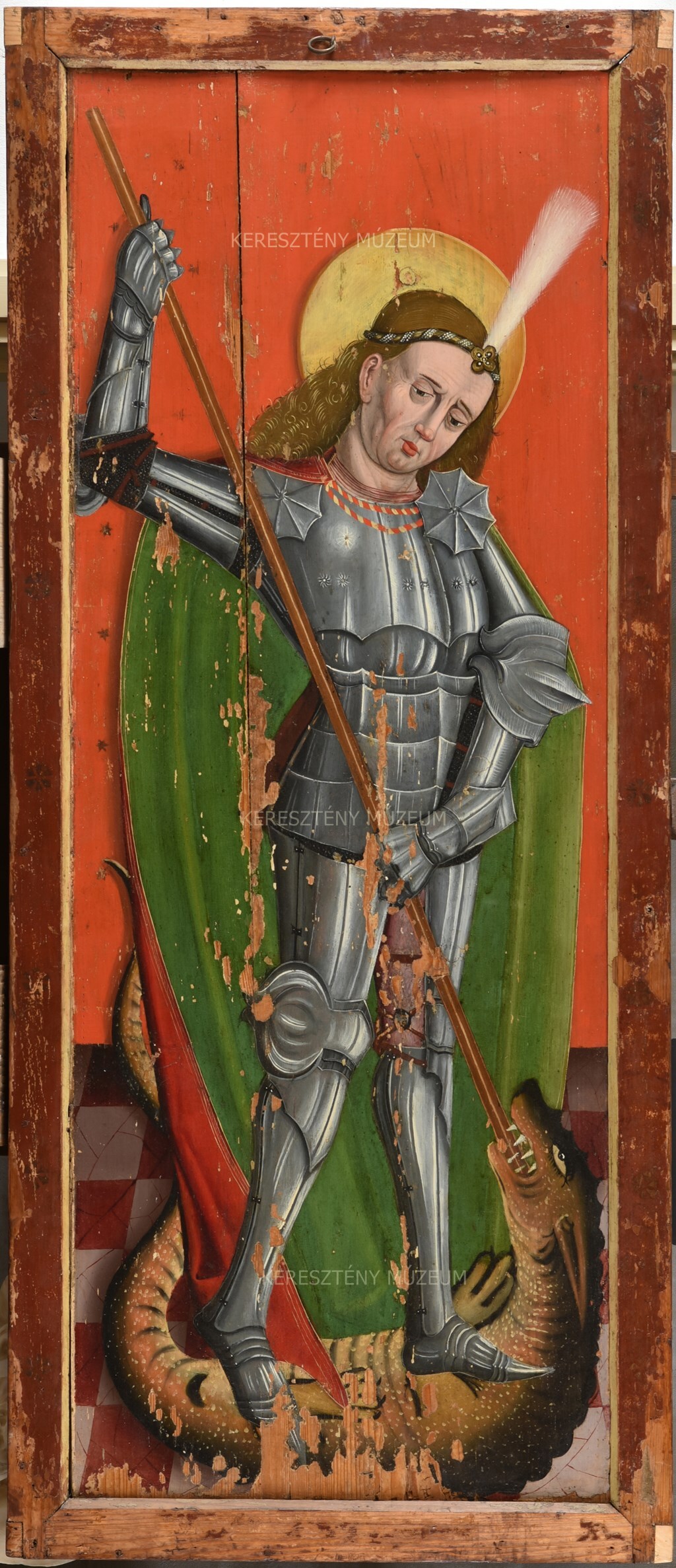 The image of St. Margaret treading on a dragon appeared on the former left, inner side of an altarpiece wing. In the background, in the lower part, is a red brocade curtain and, in the upper part, a gilded pattern. In the lower left corner of the painting, a donor in a monk’s white garb kneels at the saint’s feet; he is identified by an inscription in Gothic minuscule that extends in front of him. The image on the verso shows the armoured figure of St. George, also trampling a dragon. The background was originally adorned with iridescent stars against a red ground; most of the starts, however, are now missing, as the work experienced significant paint loss. In its 1964 catalogue, the Christian Museum inexplicably linked the inscription to the Benedictine abbey of Lekér in Bars County, and the monk’s habit was mistakenly identified as Cistercian.