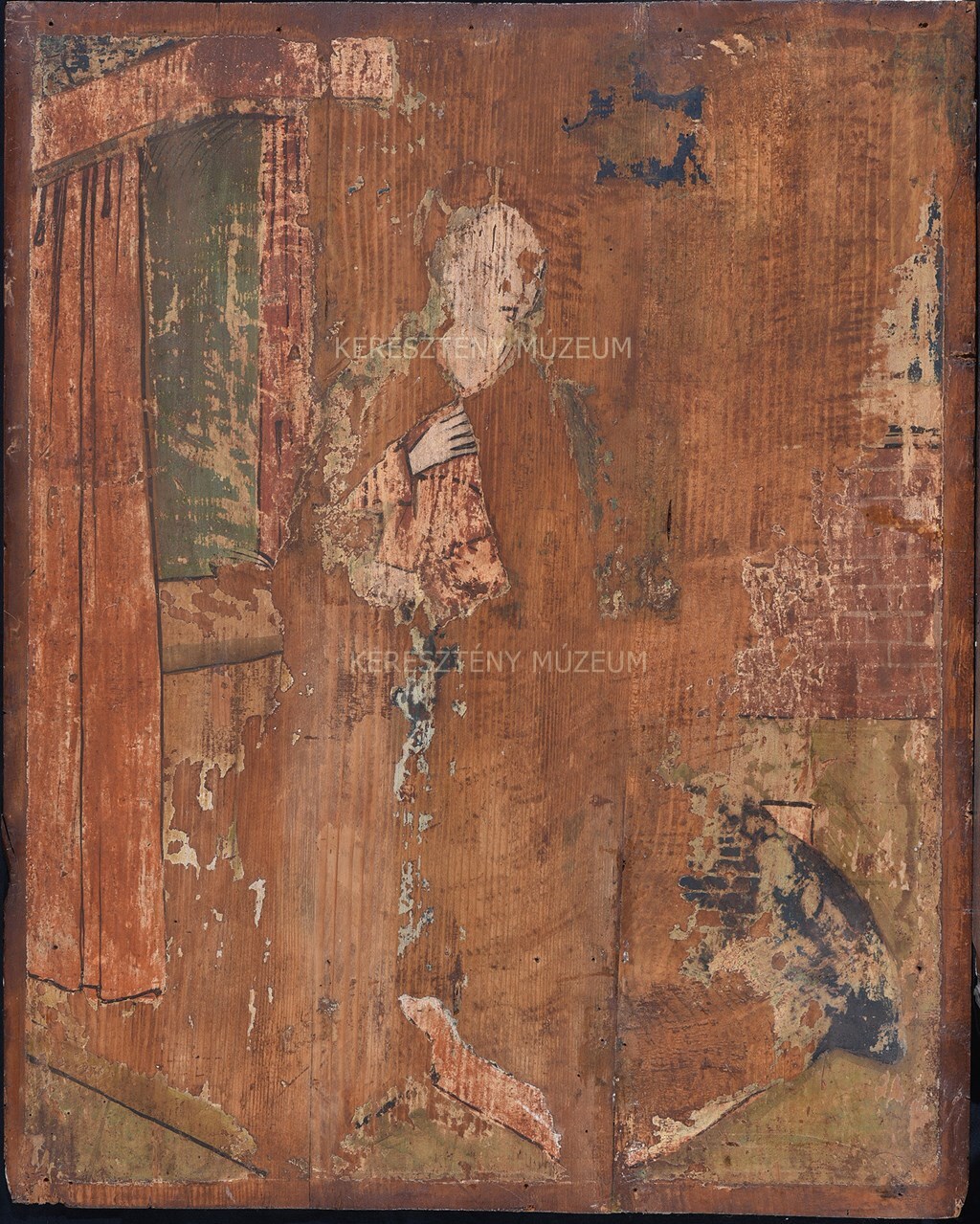 The panel was the companion to the painting showing the burning at the stake of the scholars converted by St. Catherine (55.84). This is corroborated by the presence on the reverse of each panel of elements that together form an Annunciation depiction.