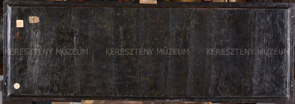The predella, which once had two movable wings, was painted on a single board. The central, double image showing the Kiss of Judas and Christ Carrying the Cross was enclosed in a punched, gilt frame. Hinge fastenings for attaching the movable wings are visible on both sides of the frame. The corresponding styles and dimensions as well as the placement of the hinges clearly indicate that the left movable wing of the predella (triptych?) had displayed the panel painting Evagationes Spiritus (56.495), owned by the Christian Museum. Hatching was added to a large swath of the predella’s surface.