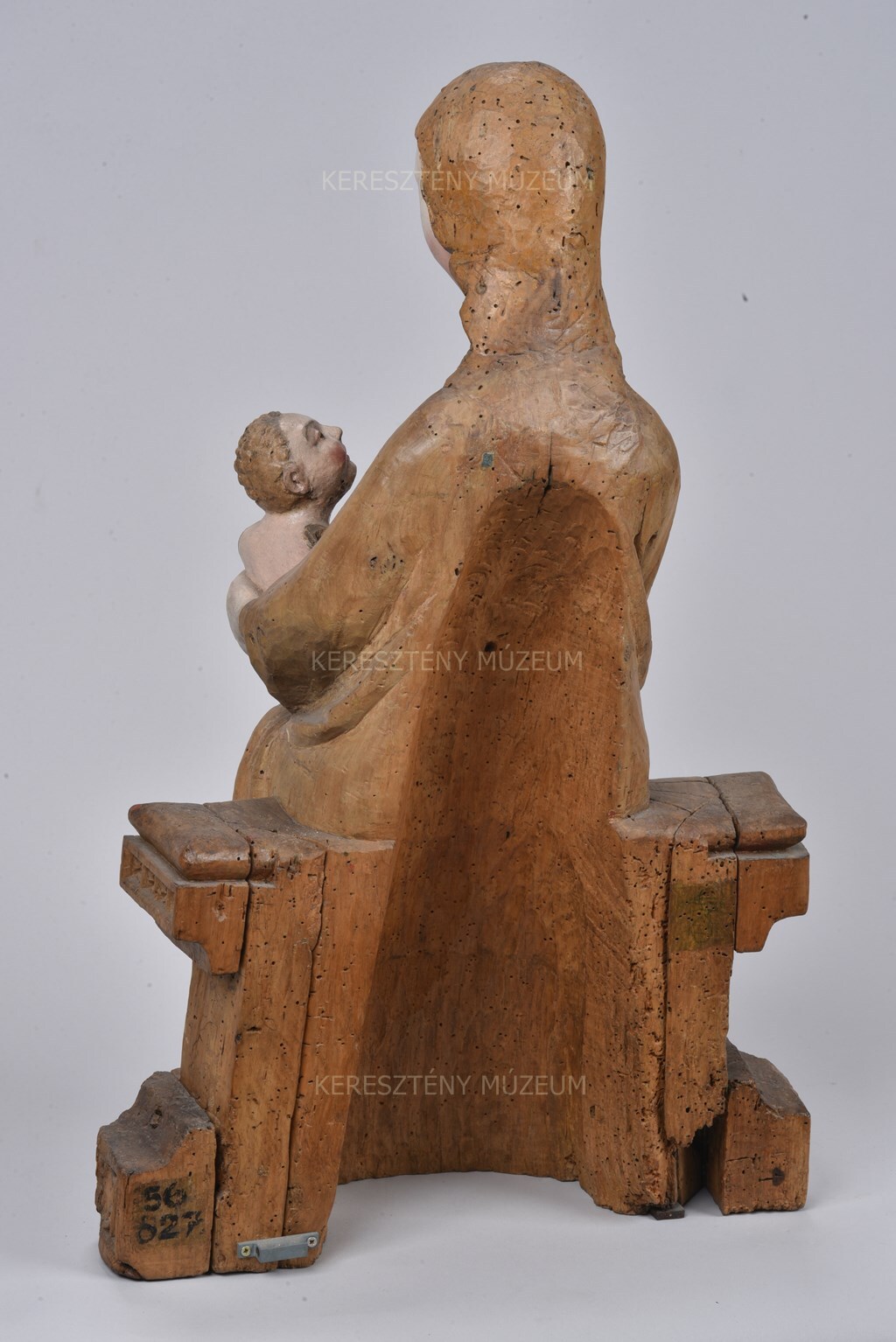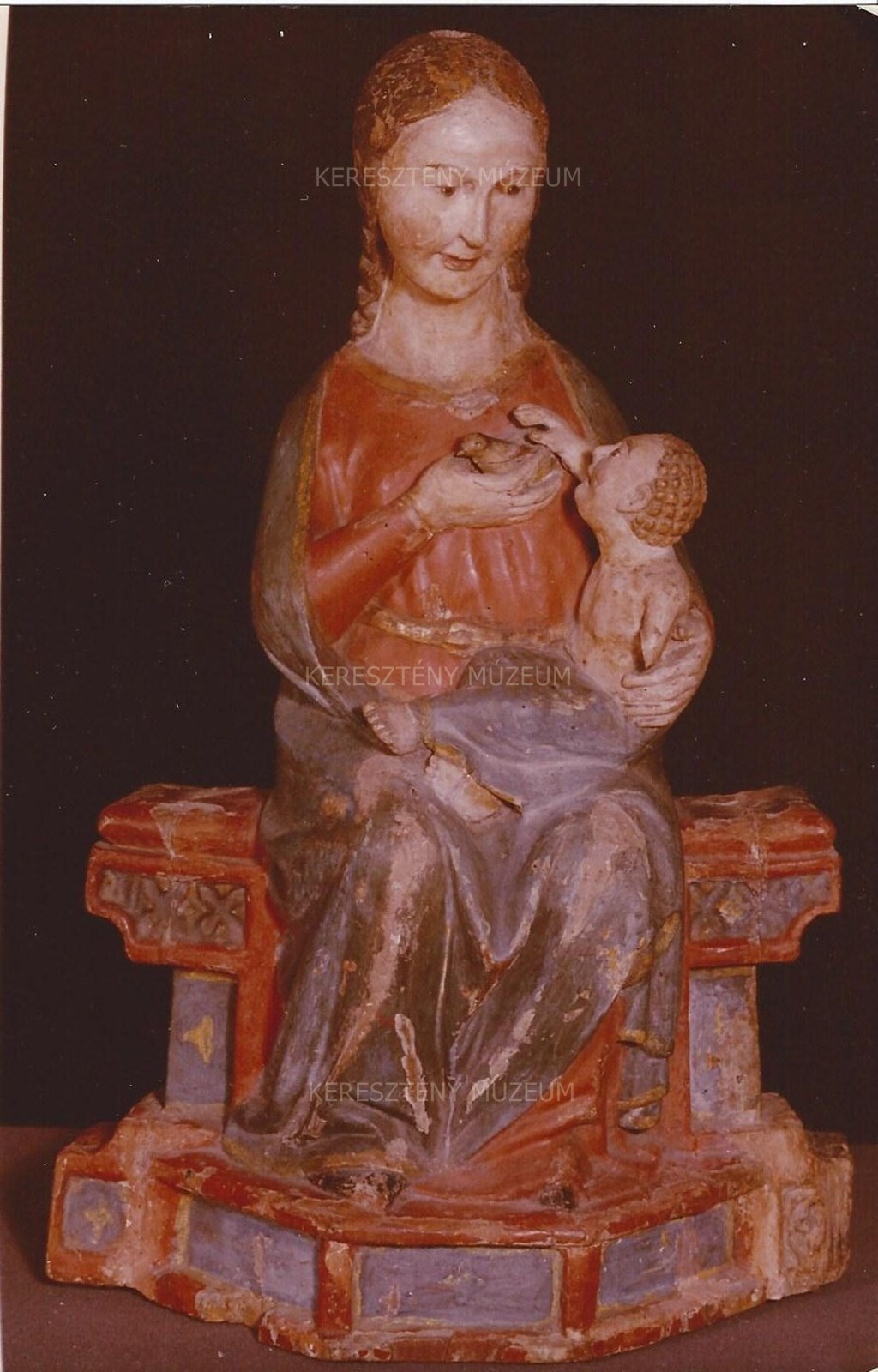 The statue of the enthroned Mary nursing her child may have been redesigned and repainted in the 18th-19th centuries. A bird was placed in the nursing Virgin’s right hand, which had once held her breast. The original, presumably badly worn paint was removed, and the statue may have been somewhat re-carved and later completely repainted. The work was repaired and repainted several times over the years. During restoration in the 1970s, several layers of paint were removed. (This information is based on Péter Menráth’s oral account.)