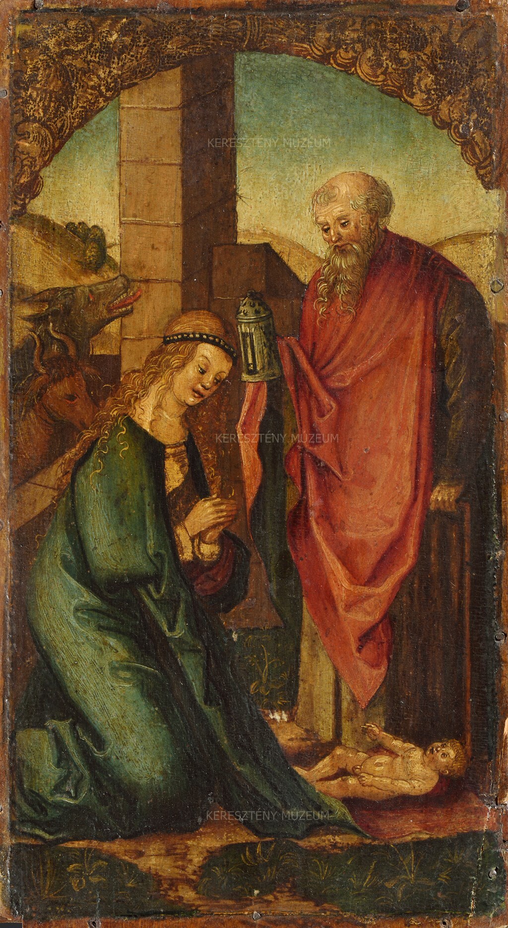 The two small panels depicting the Birth of Jesus and the Circumcision presumably adorned the wings of a private altar showing scenes from the Infancy of Jesus. Visible all the way around both paintings are margins that indicate the location of the former frames. The original panels were thinned, or the presumably decorated versos of these wing panels were sawed off. When they were restored the panels were transferred to supports that were either new or in secondary use. At the top, both paintings have painted gold leaf and vine ornamentation forming arches decorated with Renaissance forms.