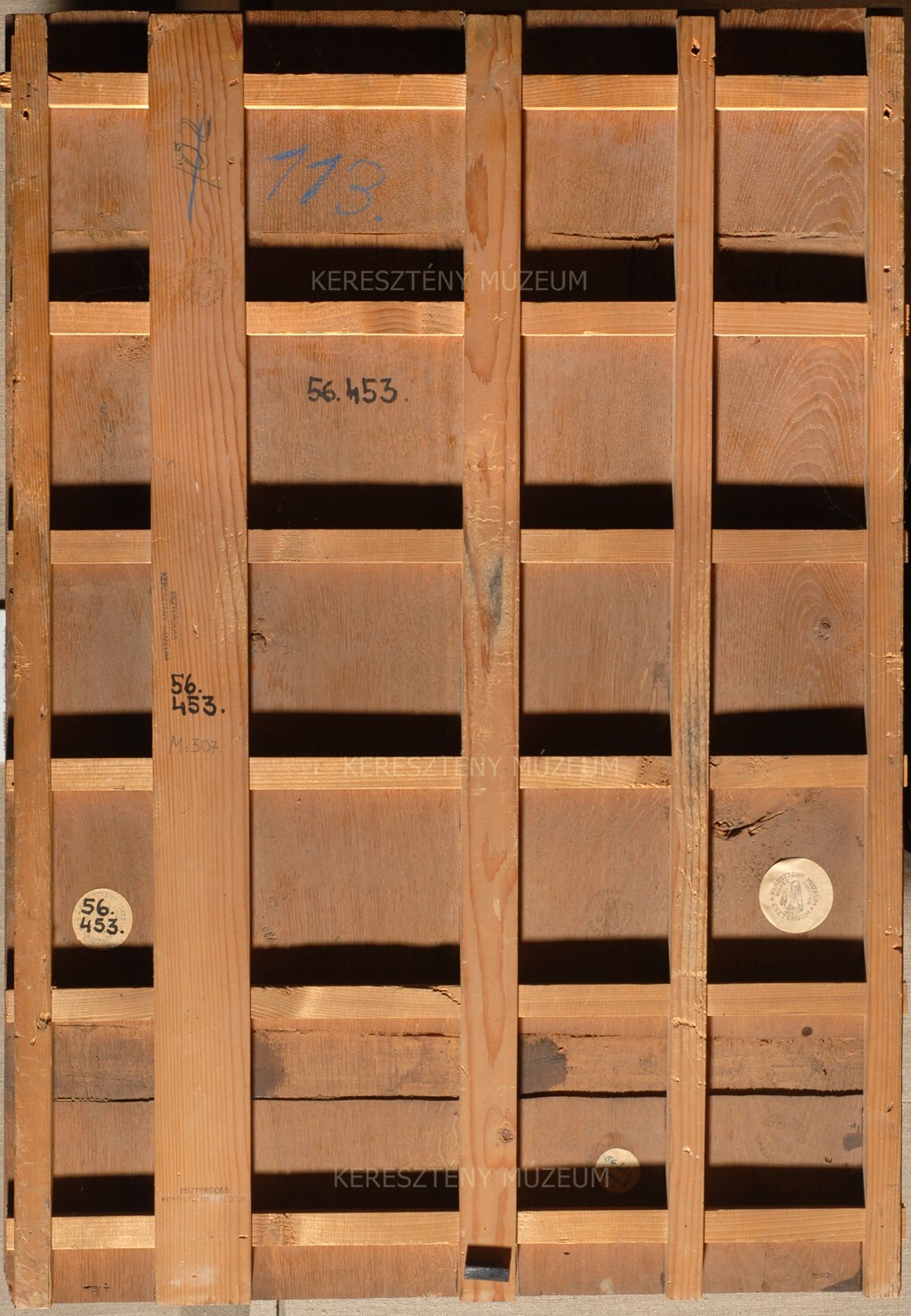 The figure of Mary seated under and apple tree nursing the Child in her lap was a relatively frequent element in the oeuvre of Cranach. The composition with Joseph and the animals, however, appears in a nearly identical form only in one workshop painting made around 1530. (See: http://lucascranach.org/PRIVATE_NONE-P118) This is perhaps identical to the picture auctioned at Christie’s on 5 December 1969, which corresponds in every detail with respect to composition and is of very similar size (87 x 59 cm) to the Esztergom panel (this information provided by János Végh).