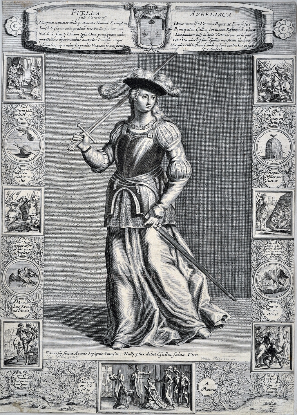 PVELLA AVRELIACA / Sub Carolo 7.o // Magnum et Memorabile protegentis Numinis Exemplum, / Inusitato sexus exitu praebuit haec Puella, summorum / Nobilioris saeculi Ducum ipsa Dux priusquam miles, / quae Bellicis discriminibus audacter immista, neque / Secundis, neque adversis praeliis Vnquam frangi potuit. // Donec convulsae Domus Regiae ac Eversi fere / Principatus Gallici fortunam restituerit. plura / Exequutura, nisi in ipso Victoriarum cursu quae / Velut Hercules Infestum Galliae monstrum devicerat, Vt / Hercules etiam hostium fraude et igne contra Ius et fas occubuisset.