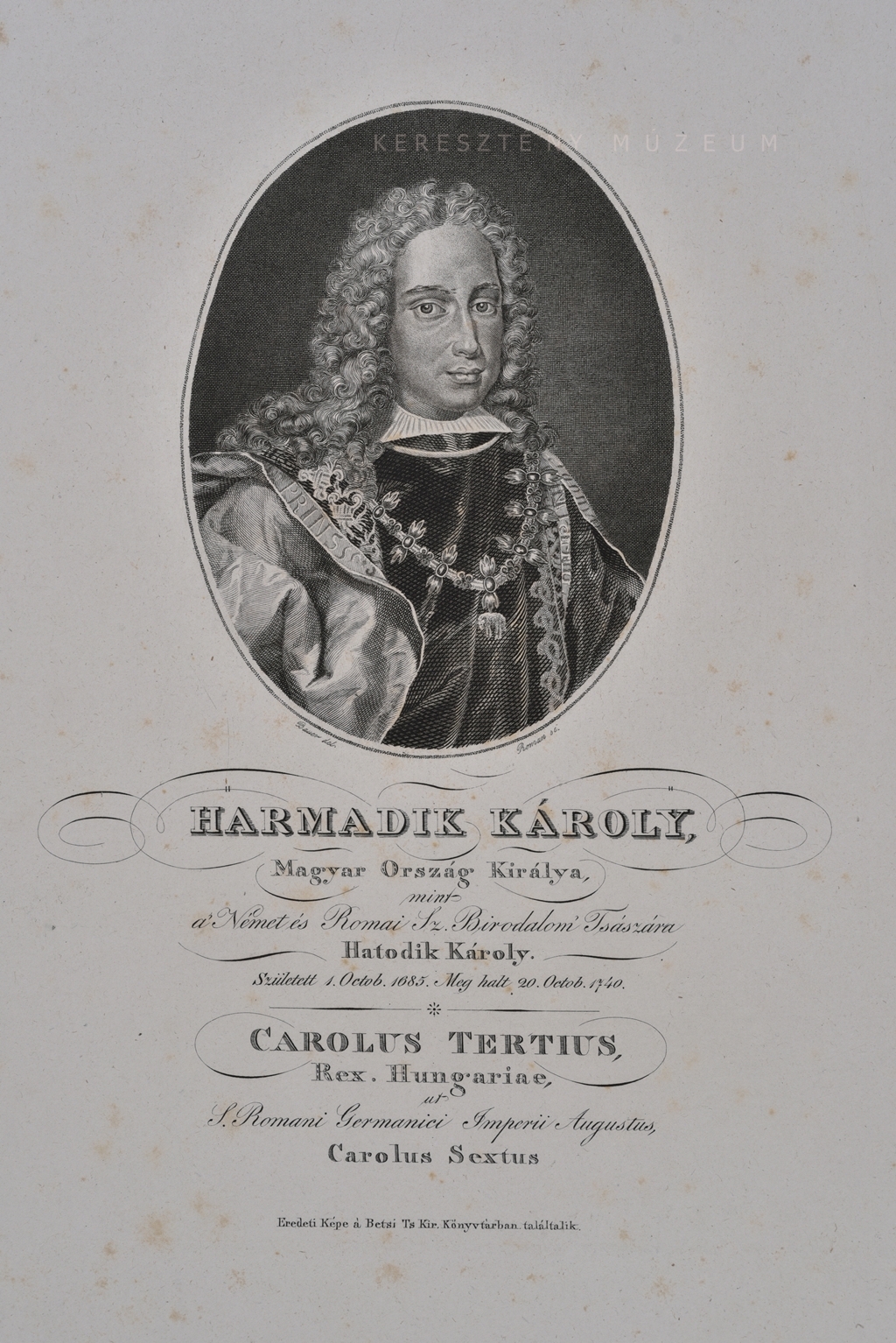 Harmadik Károly, / Magyar Ország királya, / mint / a' Német és Római Sz. Birodalom' Tsászára / Hatodik Károly. / Született 1. Octob. 1685. Meghalt 20. Octob. 1740. / Carolus Tertius, / Rex Hungariae, / ut / S. Romani Germanici Imperii Augustus, / Carolus Sextius.